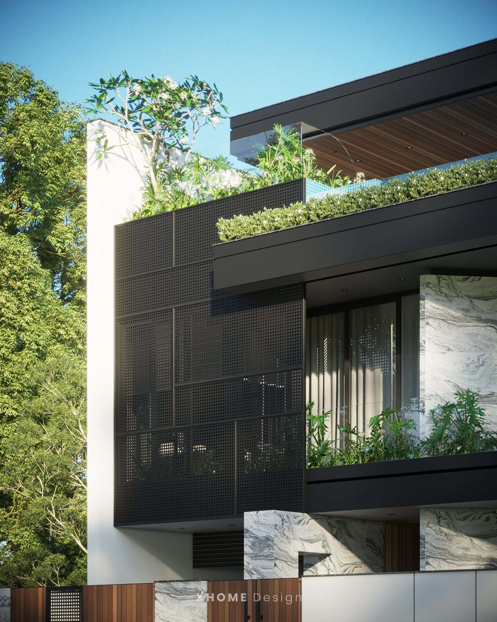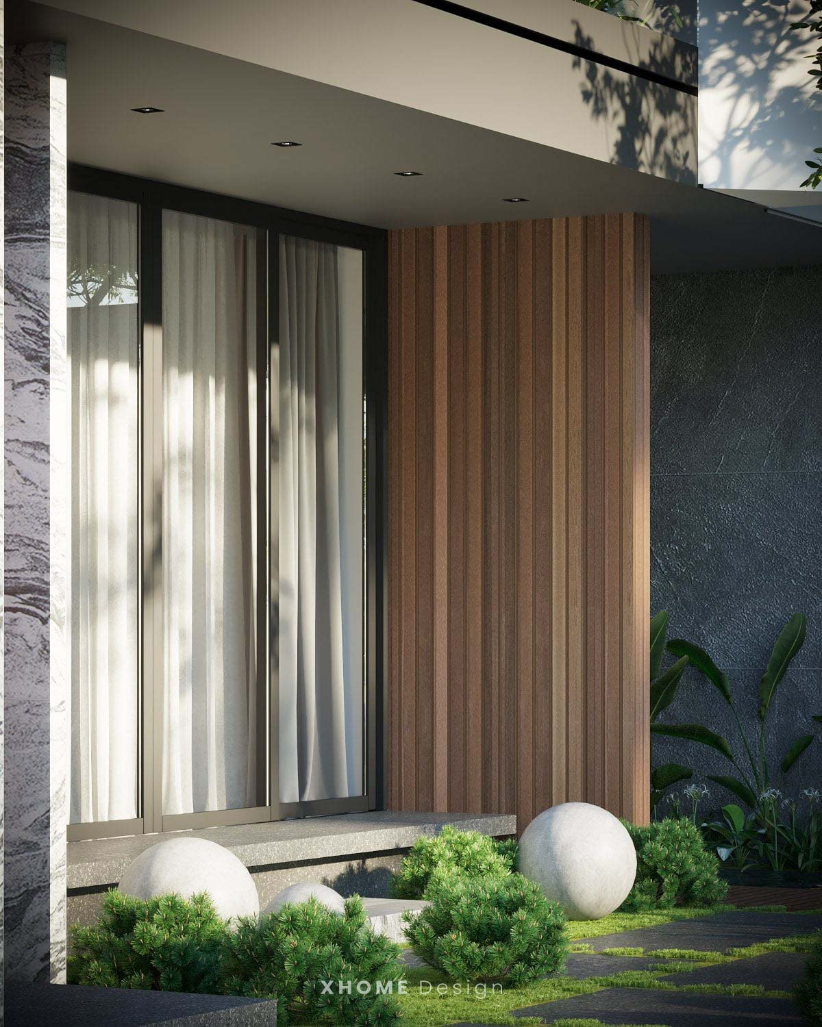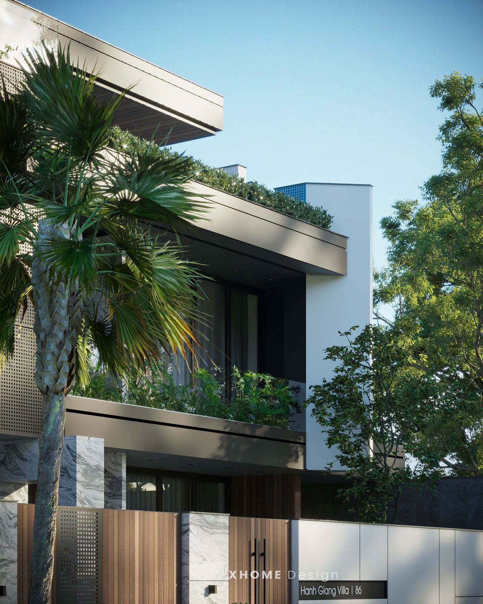Mặt tiền biệt thự 3 tầng mái nhật có hồ bơi sân thượng Hanh Giang Villa được thiết kế đơn giản nhưng không kém phần sang trọng. Với sự kết hợp hài hòa giữa các mảng tường trắng, lam chắn nắng bằng gỗ và các mảng xanh. Mỗi tầng đều có ban công riêng, được bố trí cây xanh và hoa, tạo không gian thư giãn, gần gũi với thiên nhiên. Hàng rào được thiết kế đơn giản với các thanh lam gỗ, vừa tạo sự riêng tư, vừa đảm bảo thông thoáng.