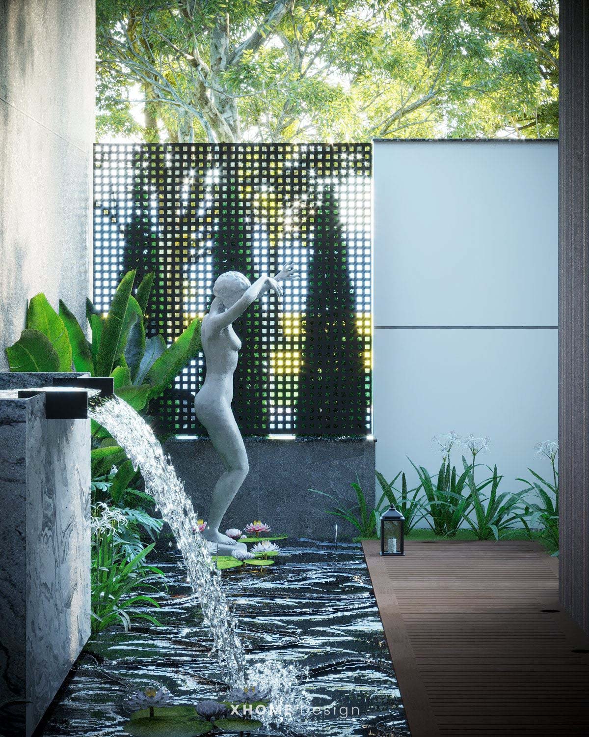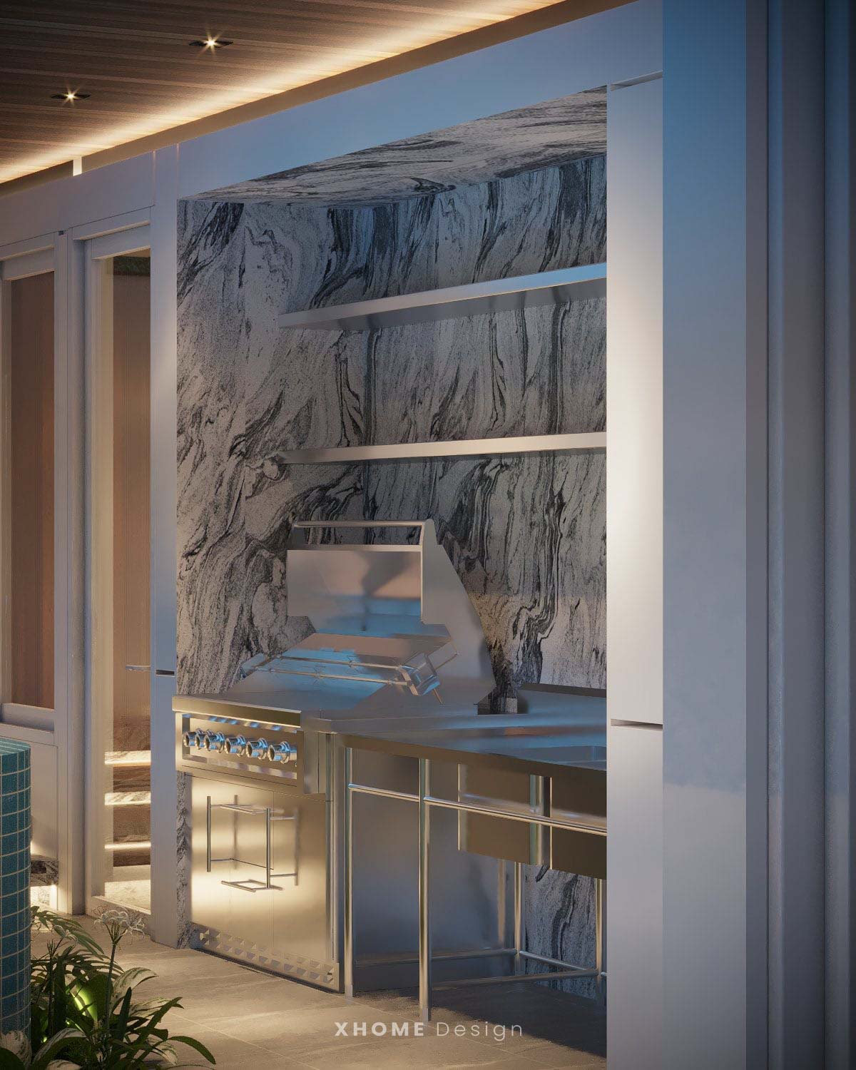 Bên cạnh đó, các tiện ích ngoài trời của biệt thự cũng được thiết kế một cách tỉ mỉ và chu đáo. Khu vực BBQ ngoài trời được trang bị đầy đủ các thiết bị, đồ nội thất, là nơi lý tưởng để tổ chức các bữa tiệc nhỏ thân mật cùng gia đình và bạn bè. Không gian này cũng bao gồm các khu vực ngồi nghỉ thư giãn, được bao quanh bởi vườn treo xanh mát và các tiểu cảnh tạo không khí yên bình, lý tưởng để đọc sách hoặc thưởng thức một tách cà phê buổi sáng. Những khu vực này được thiết kế để khai thác tối đa ánh sáng tự nhiên và khí hậu mát mẻ từ không gian xanh, mang đến cho gia chủ một không gian sống đầy sức sống và tươi mới.