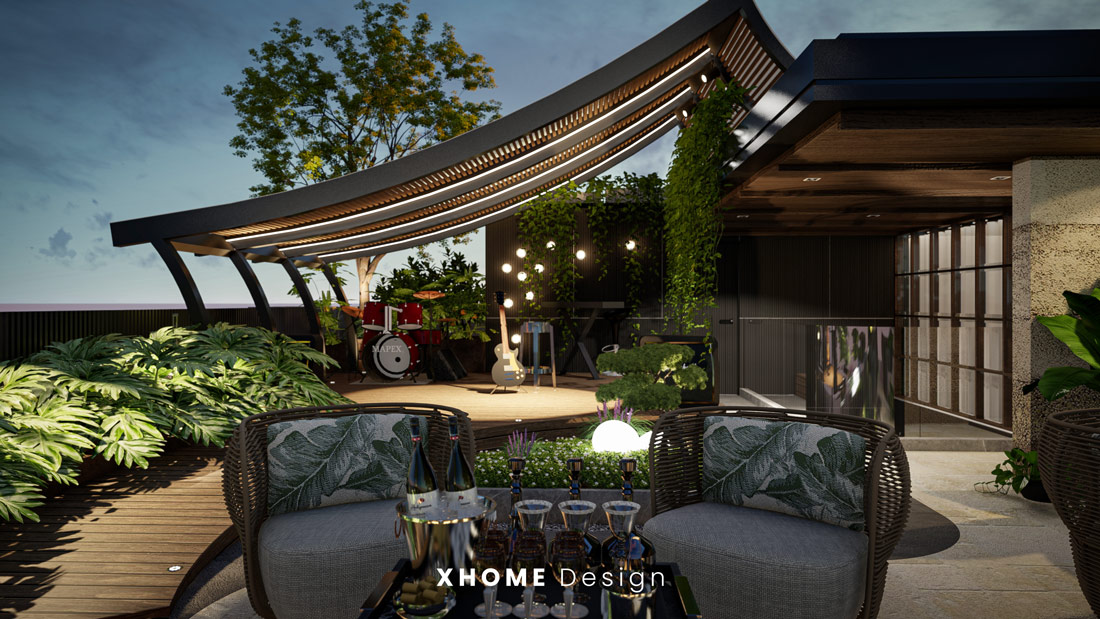 Không gian này cũng được trang bị các tiện ích như khu vực thưởng thức rượu, sân khấu, lý tưởng cho các buổi tụ họp bạn bè hay các bữa tiệc nhỏ. Thiết kế đặc biệt này không chỉ tạo điều kiện để các thành viên trong gia đình có thể thư giãn và tận hưởng thời gian bên nhau, mà còn mở ra tầm nhìn tuyệt đẹp ra khu vực xung quanh, mang lại cảm giác thanh bình và gần gũi với thiên nhiên.