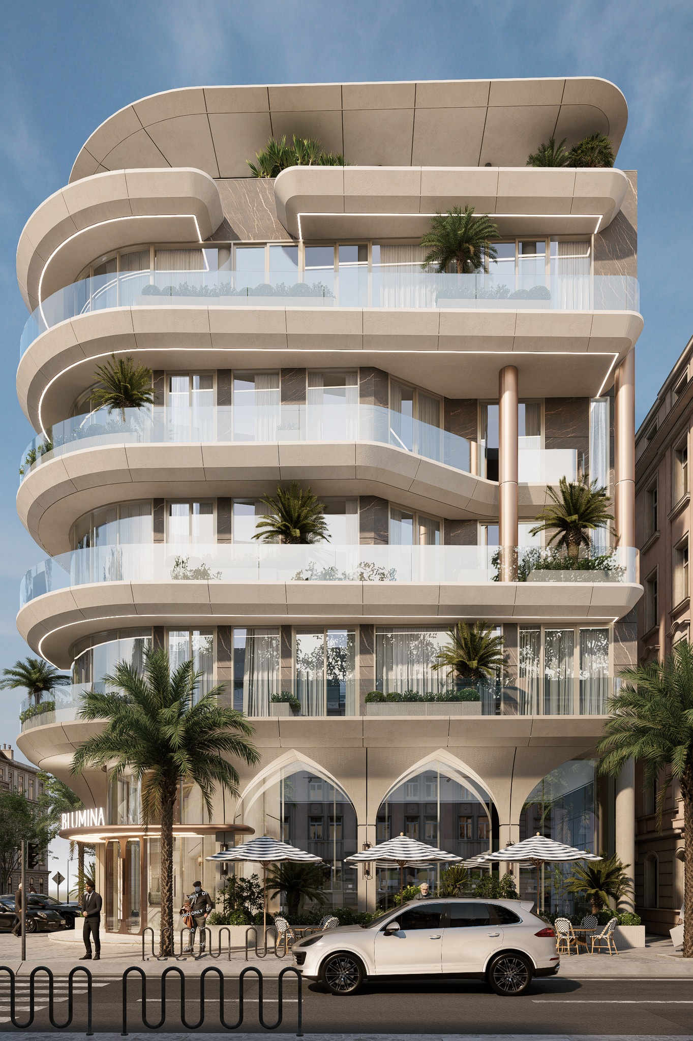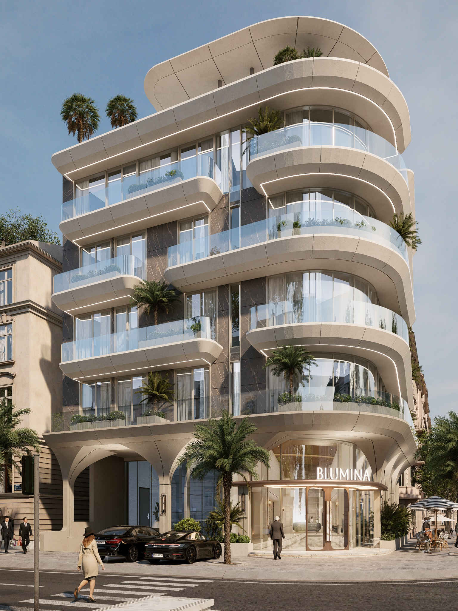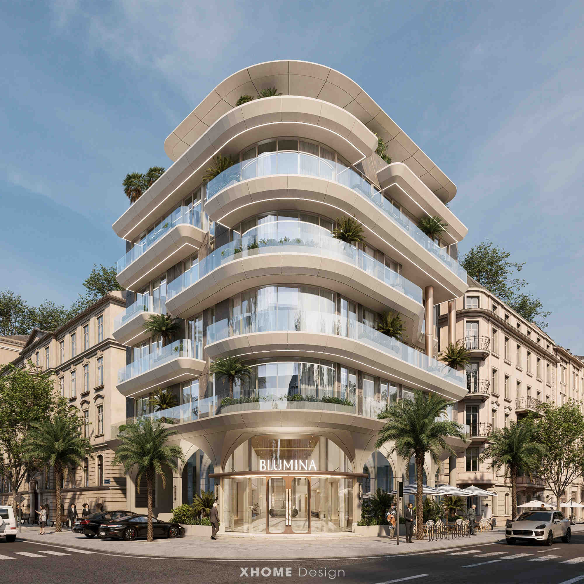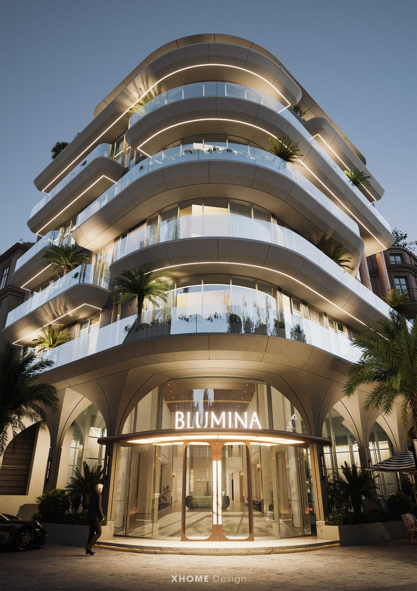 Blumina Building gây ấn tượng với thiết kế bo cong mềm mại, tạo nên diện mạo khác biệt và giàu tính nhận diện giữa phố thị. Các tầng được mở rộng với ban công kính trong suốt, đón trọn ánh sáng tự nhiên và kết nối không gian xanh tinh tế. Tổng thể công trình toát lên vẻ hiện đại, sang trọng và mang hơi thở kiến trúc đầy cuốn hút.