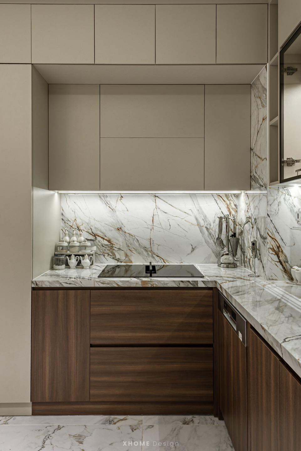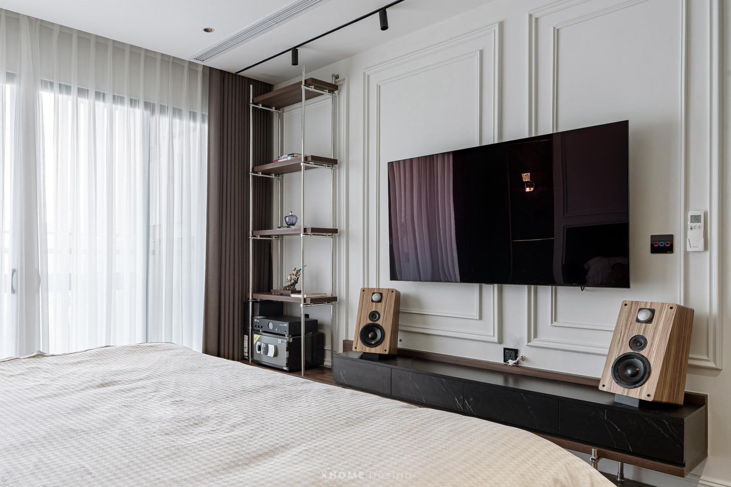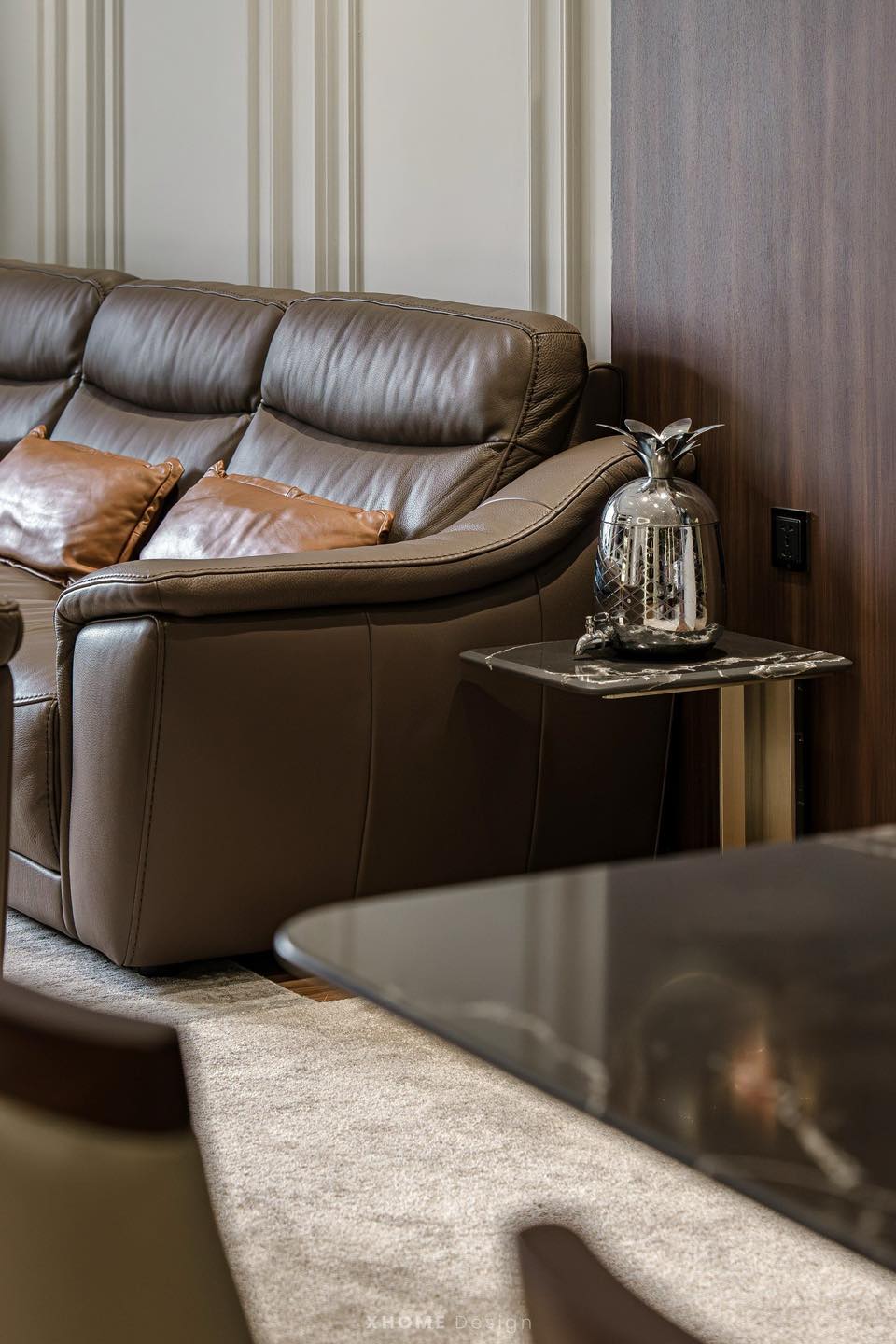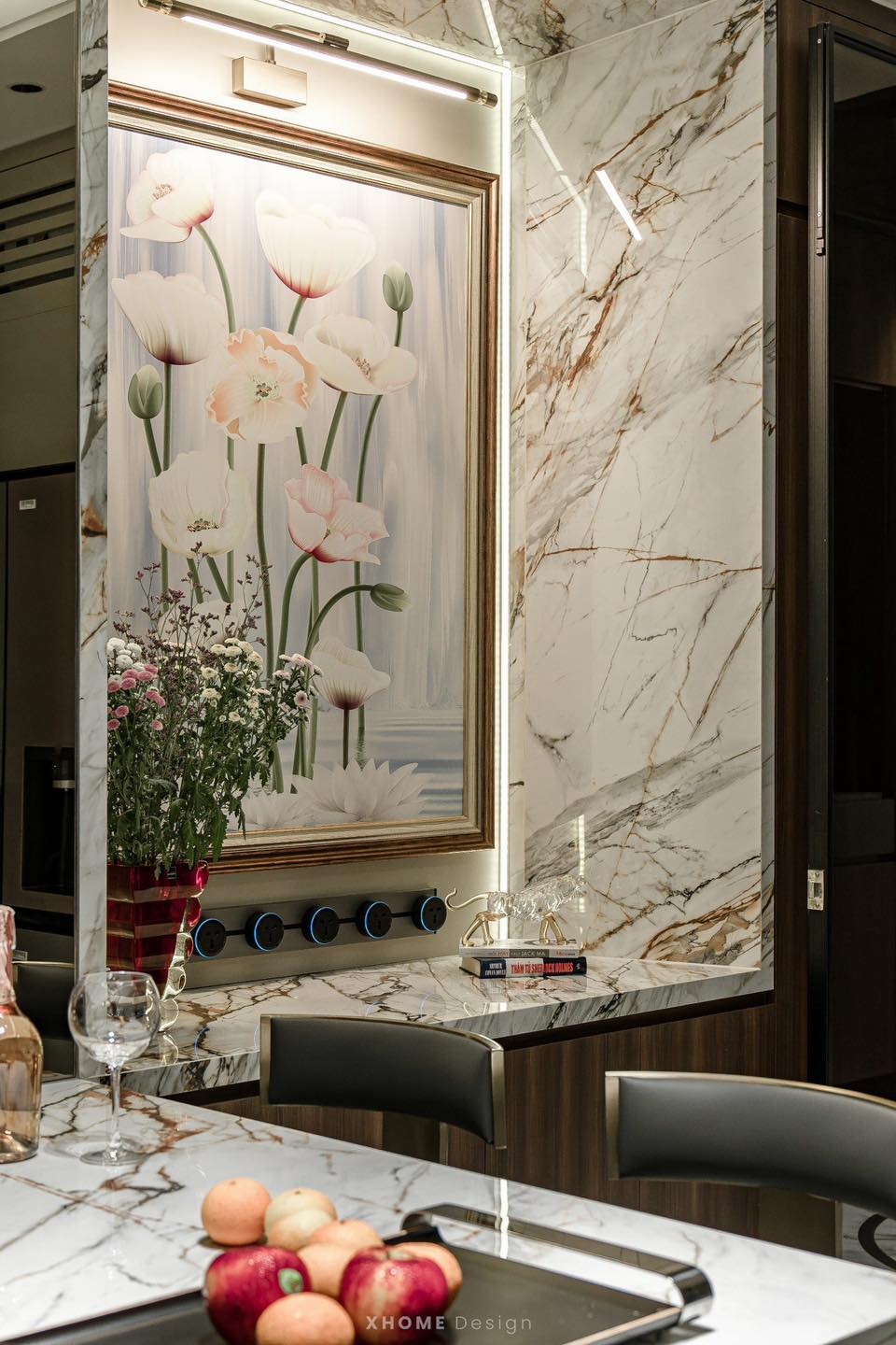 Căn hộ được XHOME thiết kế thi công nội thất theo phong cách hiện đại. Với tông màu trầm ấm – nâu và gỗ chủ đạo. Nội thất là sự kết hợp giữa phào chỉ tường tinh tế, chất liệu đá marble vân mây, da, gỗ, kim loại. Tổng thể hài hòa vô cùng phù hợp với gia chủ với độ tuổi trung niên