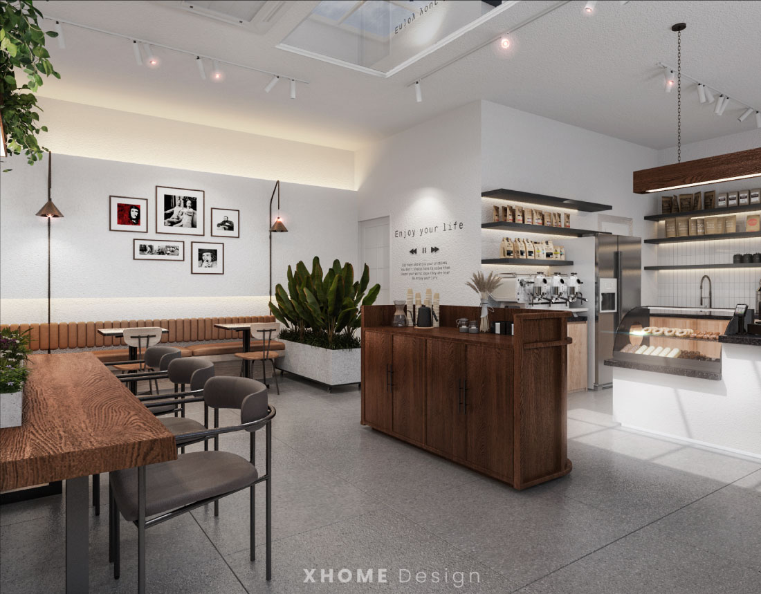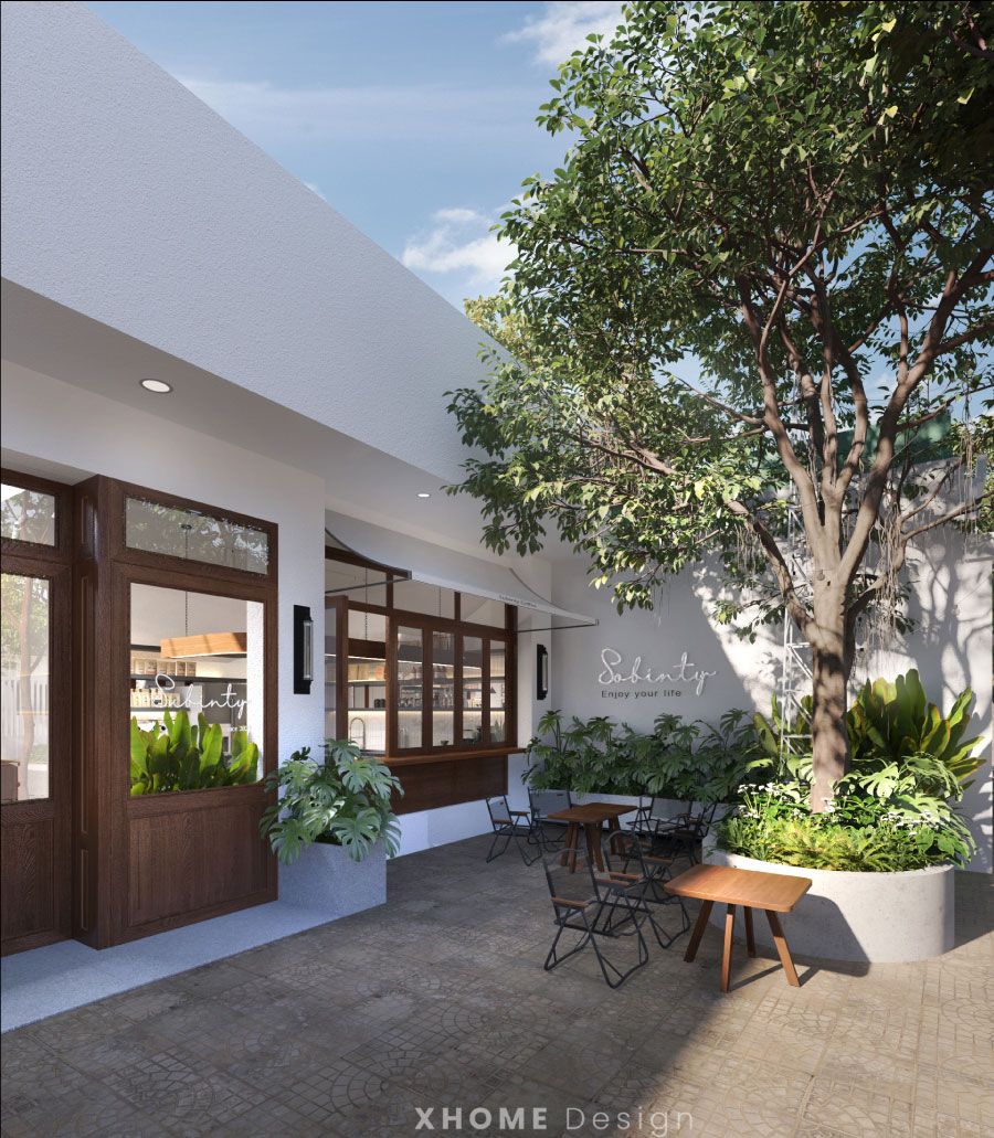 Sobinty Cafe mang phong cách tối giản hiện đại với mặt tiền thoáng rộng, đón ánh sáng tự nhiên. Không gian bên trong ấm cúng nhờ sự kết hợp hài hòa giữa tông gỗ nâu và sắc trắng tinh tế, tạo cảm giác thư giãn và là điểm đến lý tưởng để check-in.