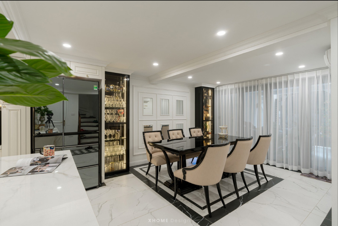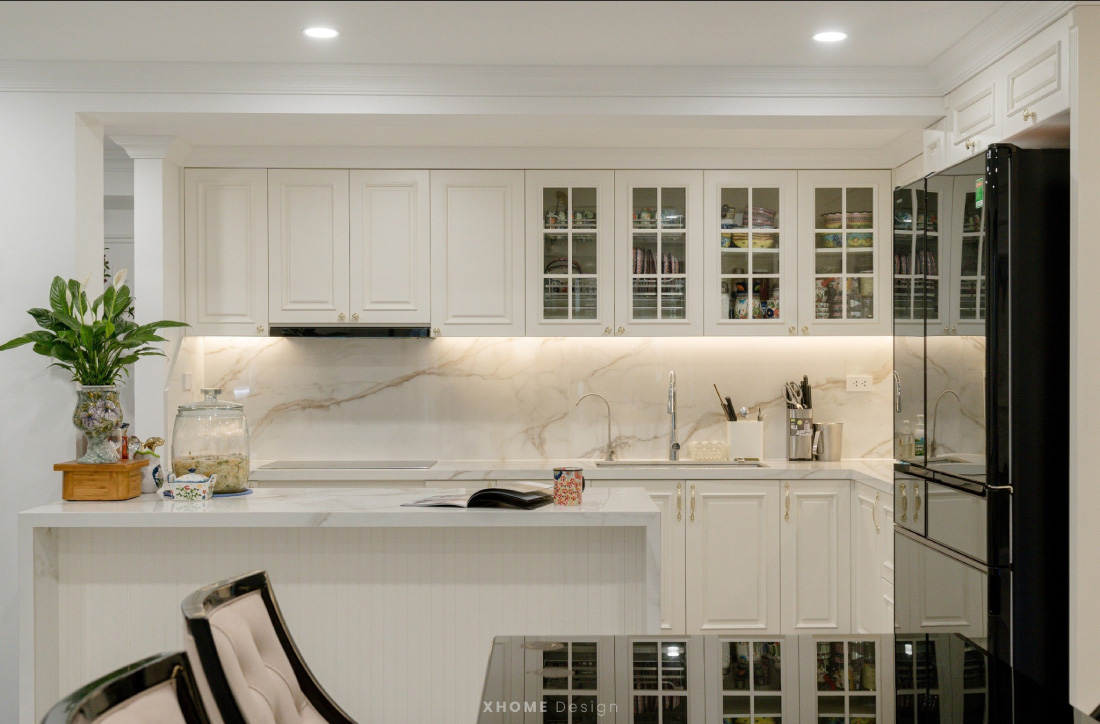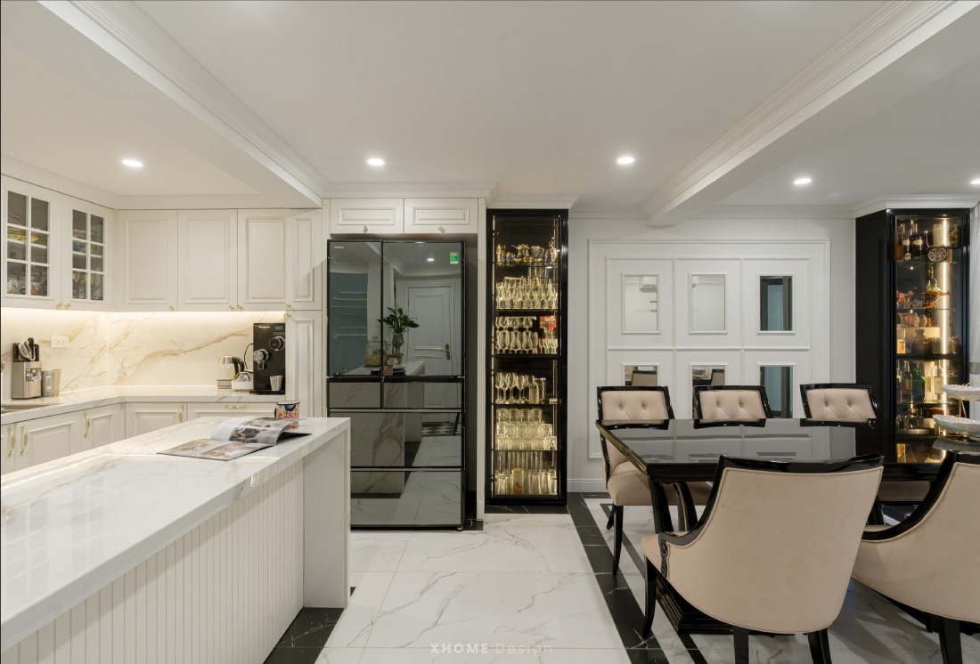 Không gian bếp – ăn được XHOME thiết kế vừa tối ưu công năng vừa nhấn mạnh tính ứng dụng và thẩm mỹ cao cấp. Hệ tủ bếp chữ L sử dụng MDF phủ sơn 2K trắng bóng mang lại cảm giác tinh tế và nhẹ nhàng. Mặt đá nhân tạo vân mây được lựa chọn đồng bộ cho bề mặt bàn và tường ốp, đảm bảo độ bền, dễ vệ sinh và tính thẩm mỹ nhất quán. Đảo bếp trung tâm được tính toán kỹ về tỷ lệ và công năng, đóng vai trò điểm nhấn kiến trúc và hỗ trợ sơ chế hiệu quả. Bàn ăn mặt kính đen kết hợp ghế bọc nỉ be nhã nhặn, hài hòa giữa cổ điển và hiện đại. Tủ trưng bày thiết kế âm tường, bố trí đèn LED ánh vàng giúp tạo chiều sâu thị giác và không khí ấm cúng. Tổng thể được xử lý theo hướng mở, giúp không gian bếp – ăn kết nối liền mạch, nâng tầm trải nghiệm sinh hoạt và cảm xúc sum vầy.