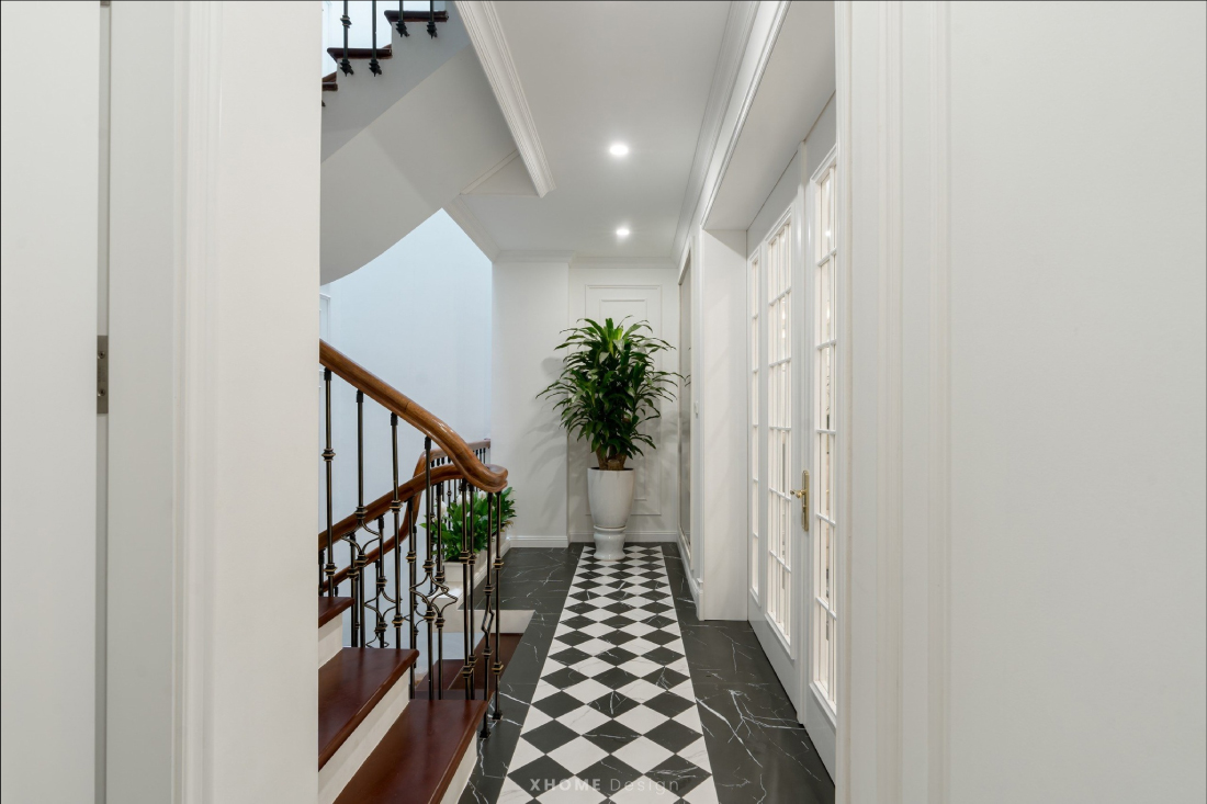 Khu vực cầu thang và sảnh liên tầng mang đậm tinh thần Tân cổ điển, vừa làm điểm kết nối giao thông đứng vừa là một không gian kiến trúc tinh tế. Từ lối vào, sàn lát gạch caro đen trắng cổ điển dẫn dắt ánh nhìn, tạo hiệu ứng thị giác sâu và thanh lịch. Hệ cửa kính khung trắng chia ô mang lại sự nhẹ nhàng, đồng thời giúp không gian luôn sáng và thoáng. Cầu thang xoắn nhẹ với tay vịn gỗ tự nhiên, lan can sắt uốn thủ công kết hợp chi tiết hoa văn đồng, tôn lên vẻ sang trọng mà không rườm rà. Các khoảng thông tầng được xử lý mở, tận dụng giếng trời để lấy sáng tự nhiên, kèm mảng xanh từ chậu cây trang trí, mang sinh khí len lỏi khắp ngôi nhà. Mặt tiền công trình được khoác lớp áo trắng tinh tế, hệ cửa vòm lớn và ban công sắt nghệ thuật đồng bộ phong cách, vừa khẳng định giá trị thẩm mỹ vừa thể hiện cá tính riêng của gia chủ giữa phố thị.