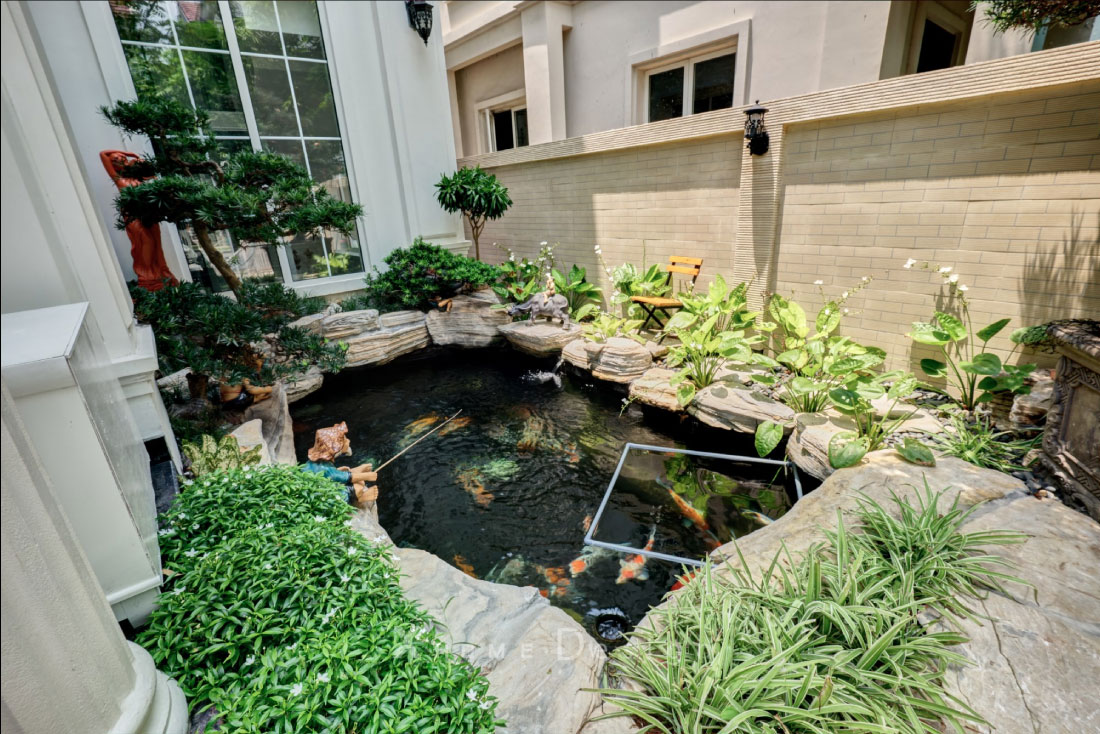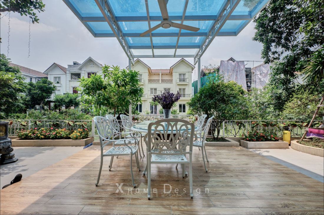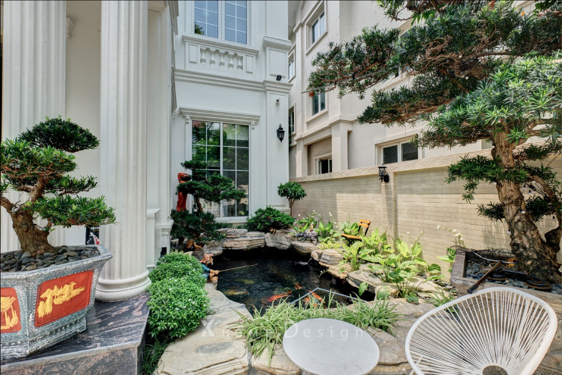 Khoảng sân vườn được thiết kế như một không gian thư giãn hoàn hảo với hồ cá Koi, bonsai tỉa nghệ, ghế nghỉ ngoài trời và bàn ăn bên hồ. Lối thiết kế mở giao thoa giữa kiến trúc tân cổ điển và cảnh quan sinh thái đã mang đến hơi thở nhẹ nhàng, trong lành và đầy thi vị cho toàn bộ biệt thự Vinhomes Riverside 2.