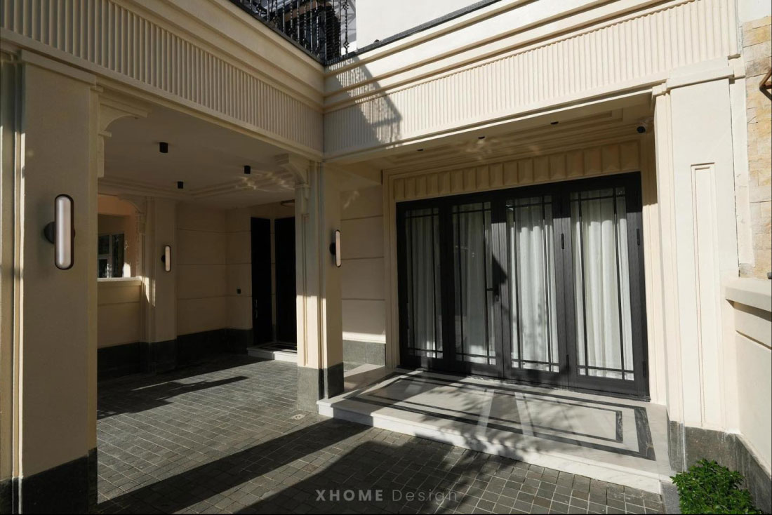 Phuc Loc Vien House gây ấn tượng bởi sự kết hợp tinh tế giữa chất liệu và hình khối kiến trúc. Cổng gỗ tự nhiên với các nan chớp chéo thủ công tạo nên cảm giác vững chãi, ấm áp ngay từ lối vào. Hệ lan can sắt nghệ thuật được xử lý sơn tĩnh điện, hoa văn tối giản nhưng sang trọng, đồng bộ với hệ cửa sổ mái vòm mang hơi hướng truyền thống. Mặt đứng công trình được tạo chiều sâu nhờ các đường phào chỉ đắp nổi theo mảng lớn, kết hợp lớp sơn trắng kem có khả năng chống bám bụi, góp phần hoàn thiện vẻ ngoài tinh tế và thanh lịch. Đáng chú ý, XHOME đã ứng dụng giải pháp thiết kế lớp mái ngói giả lập nằm bên dưới hệ mái ngói chính – một chi tiết khác biệt với các căn liền kề giúp tăng hiệu quả che nắng, chống nóng, đồng thời nâng cao giá trị thẩm mỹ và tạo nên dấu ấn kiến trúc riêng cho ngôi biệt thự.