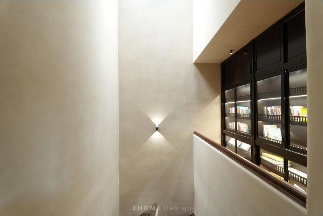 Khu vực sảnh và hành lang nổi bật với đàn piano đen đặt ngẫu hứng, tạo điểm nhấn nghệ thuật giữa hệ tủ âm tường đen nhám kịch trần có dải đèn led tinh tế. Cầu thang gỗ nâu tay vịn bo cong kết hợp tường trắng be và sàn xám, tôn lên vẻ mộc mạc, ấm áp, đúng tinh thần nội thất Wabi-sabi, mang lại sự đồng điệu và tinh tế cho tổng thể không gian.