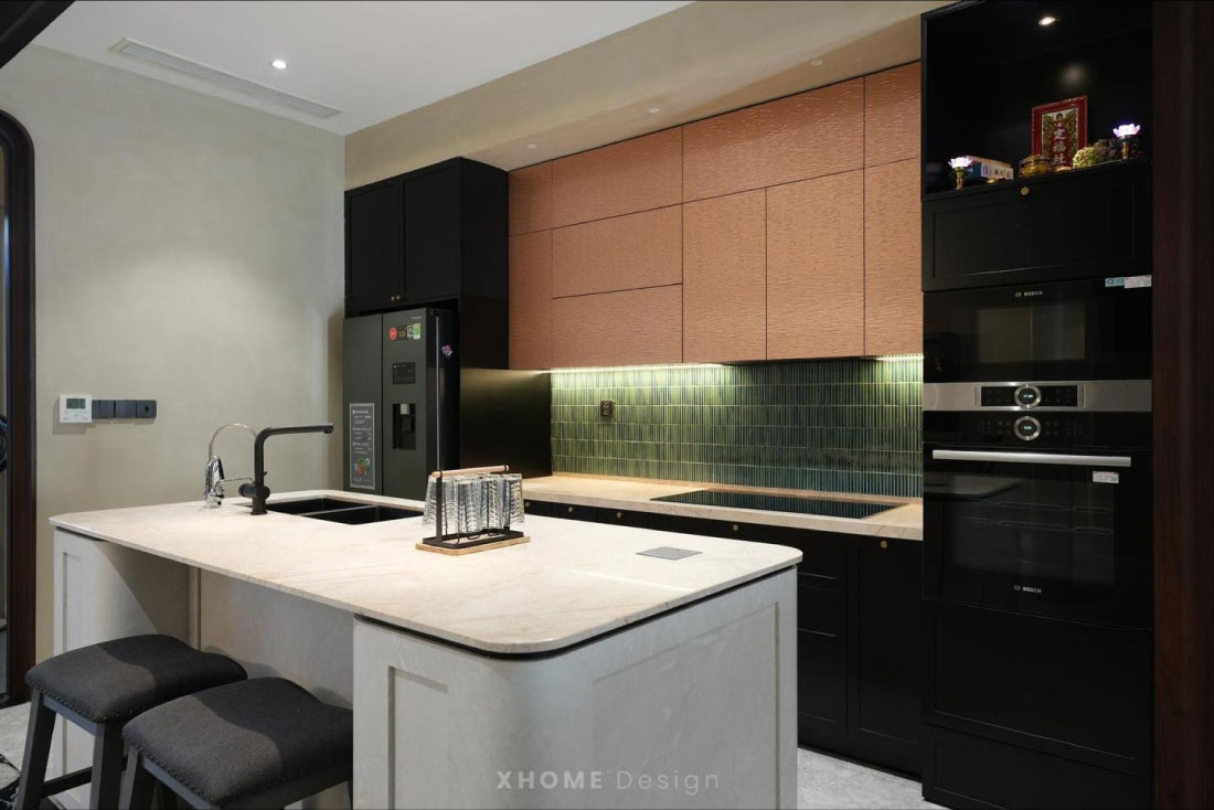Khu bếp được thiết kế mở, liền mạch với phòng khách, tạo sự kết nối hài hòa giữa các không gian sinh hoạt. Nổi bật với đảo bếp ốp đá nhân tạo vân mây bo góc mềm mại, vừa là khu sơ chế vừa là quầy bar tiện dụng, kết hợp ghế bar gỗ bọc nỉ xám đồng điệu. Hệ tủ bếp trên phủ laminate vân đồng ánh nhẹ, tủ dưới sơn đen mờ kết hợp phào chỉ tinh giản, tạo chiều sâu và sự sang trọng. Điểm nhấn đặc biệt là mảng ốp bếp sử dụng gạch gốm thẻ men xanh rêu bóng mờ, giúp không gian bừng sáng và dễ vệ sinh. Toàn bộ thiết bị bếp được tích hợp hiện đại: bếp từ âm, lò nướng, lò vi sóng, máy rửa chén và tủ lạnh âm tường, đảm bảo công năng tối ưu trong một tổng thể bếp chuẩn mực và giàu thẩm mỹ.