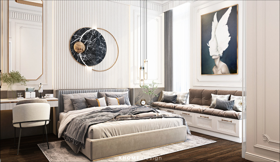 Phòng ngủ master theo phong cách Tân cổ Điển sử dụng tông màu chủ đạo trắng kết hợp với bức tường xám nâu, và các đường chỉ phào đặc trưng trên tường đã làm căn phòng trở nên sang trọng hơn và thoải mái hơn. Thiết kế thêm các khu vực phụ khác như: khu để đồ dùng quần áo, túi xách, nhà tắm, nhà vệ sinh vô cùng tiện lợi.