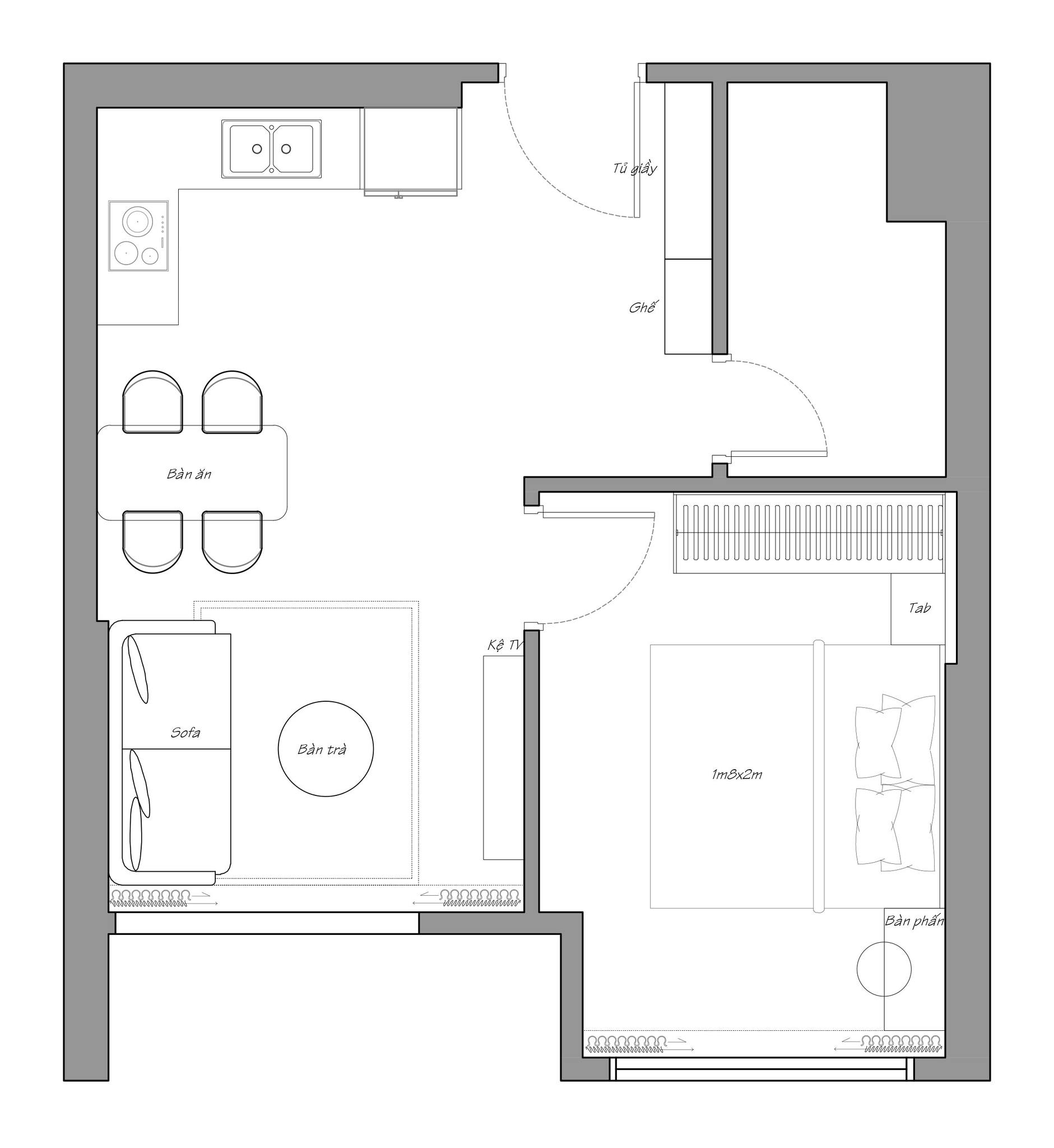 | Công năng: | Phòng khách – bếp – ăn, phòng ngủ, WC |