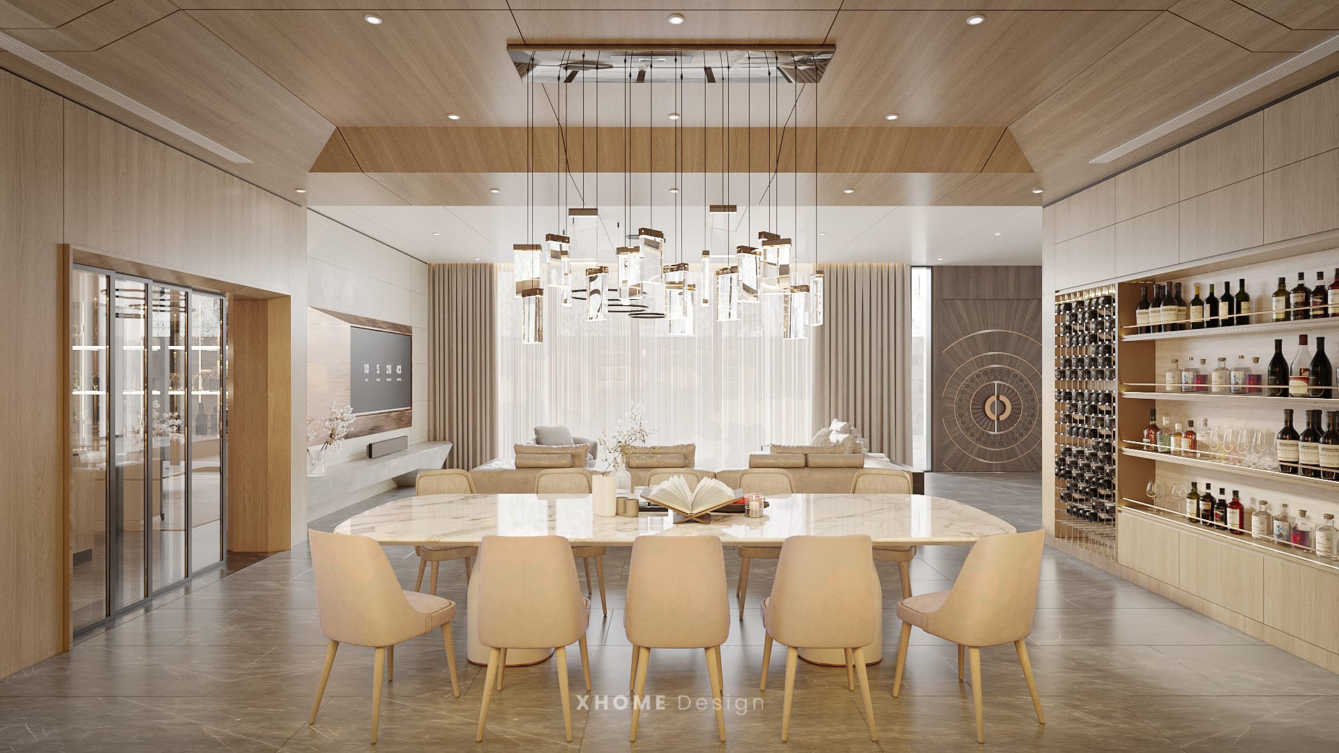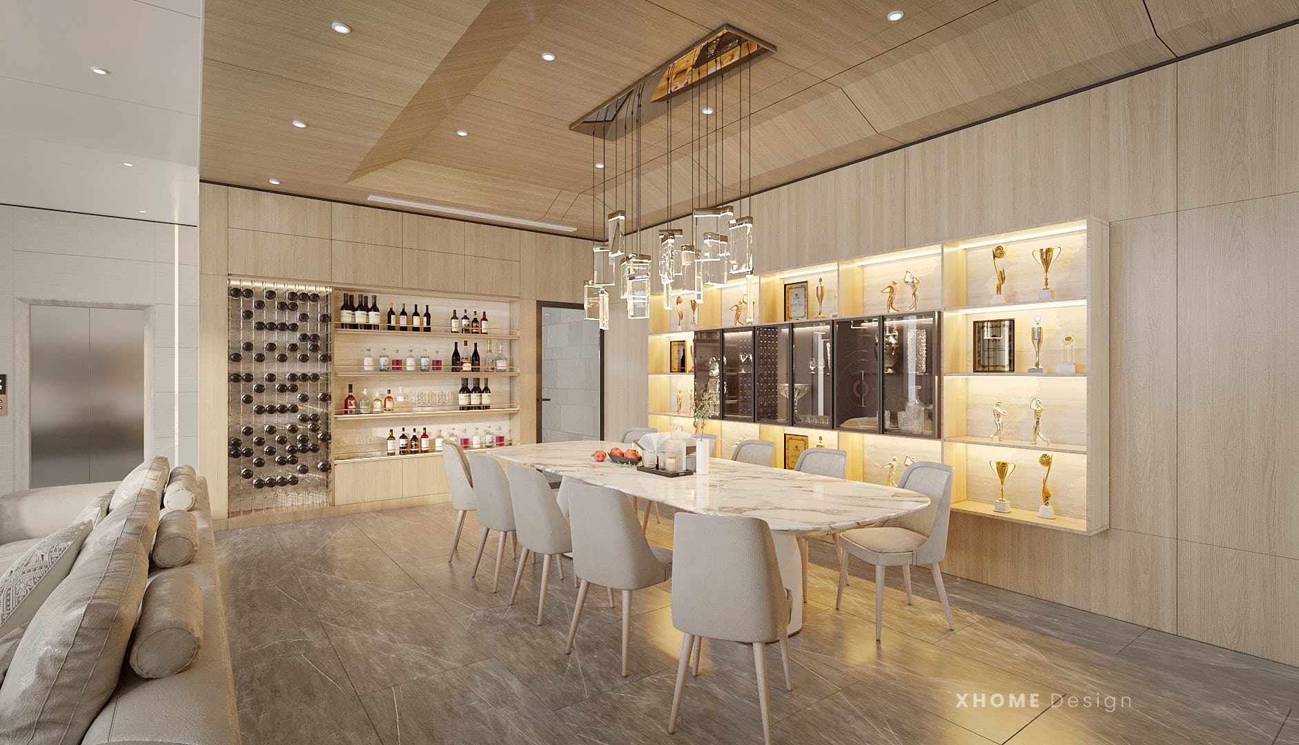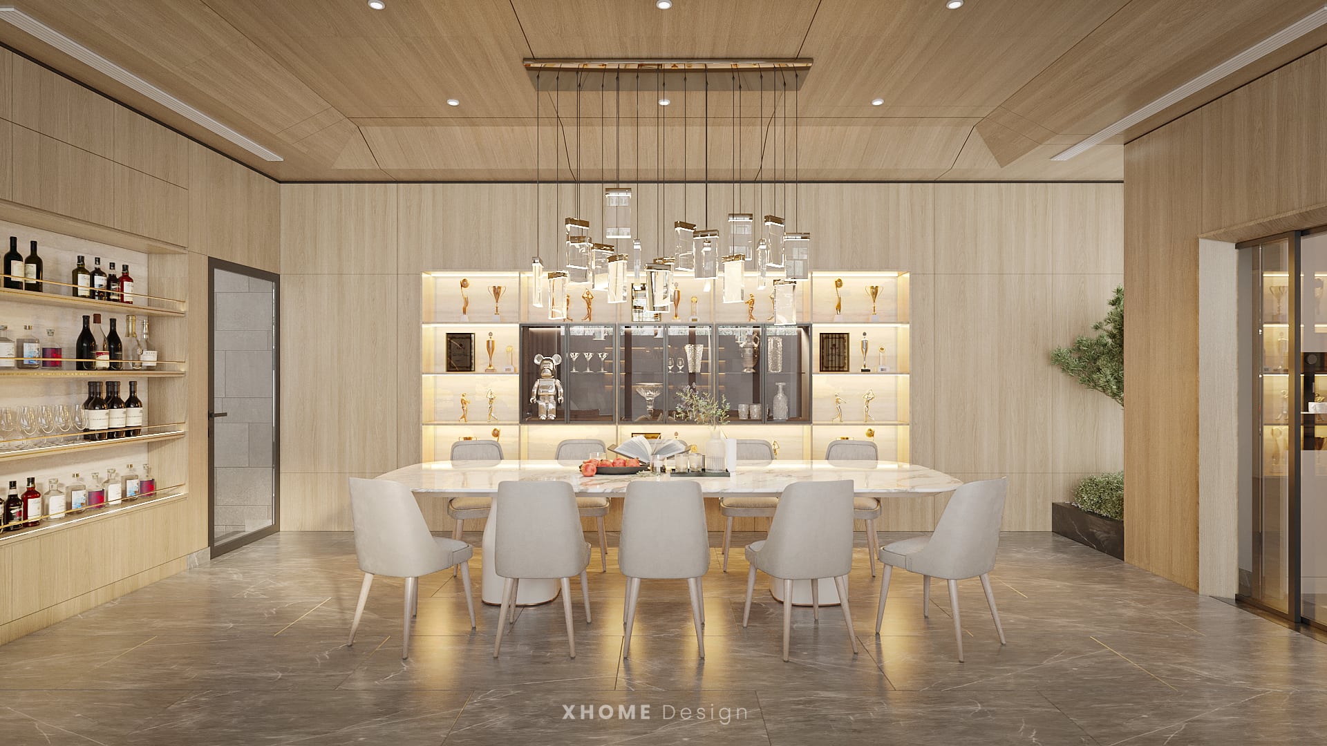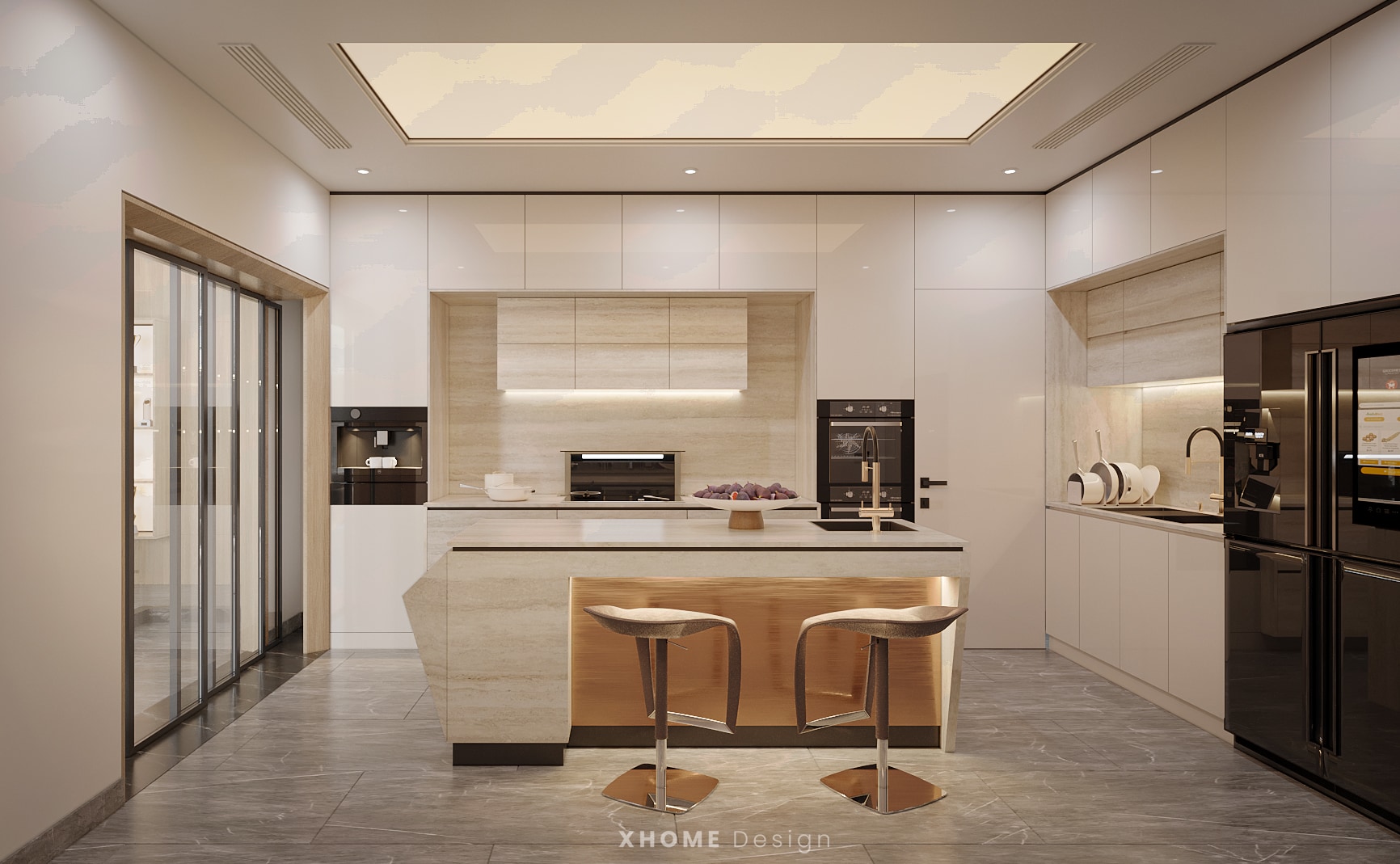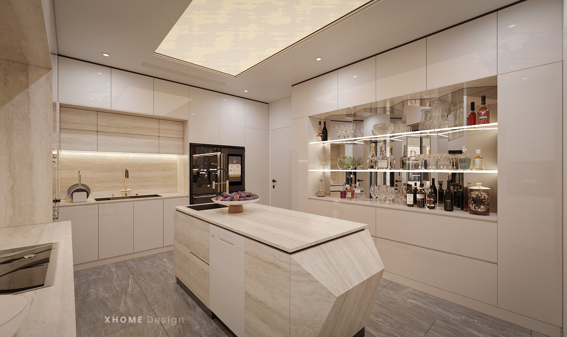 Khu vực bếp và phòng ăn được xử lý như một tổ hợp chức năng liên hoàn, với hệ tủ bếp thiết kế âm tường, bề mặt phẳng và vật liệu dễ bảo trì. Quầy bar và hệ tủ trưng bày đóng vai trò phân tách ước lệ, vừa đảm bảo công năng vừa tạo điểm nhấn cho không gian sinh hoạt chung. Hệ chiếu sáng được bố trí theo từng lớp, đáp ứng đồng thời nhu cầu sử dụng và thẩm mỹ.