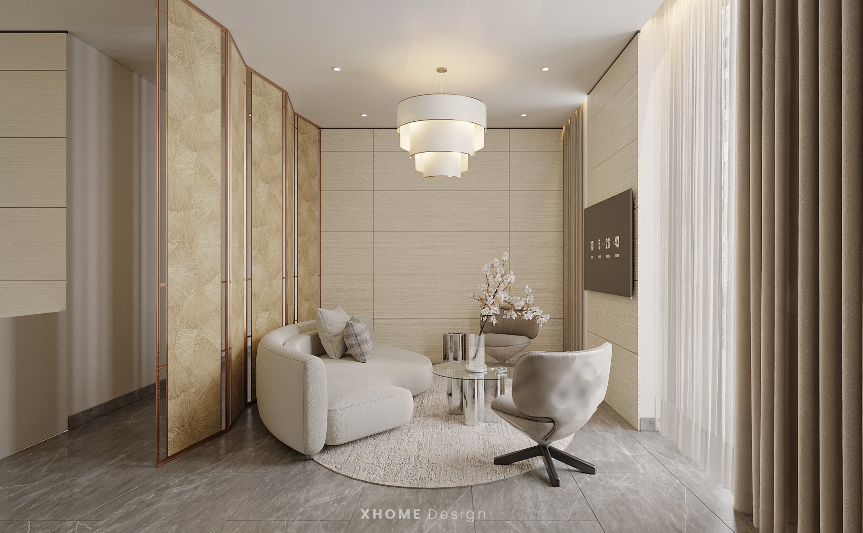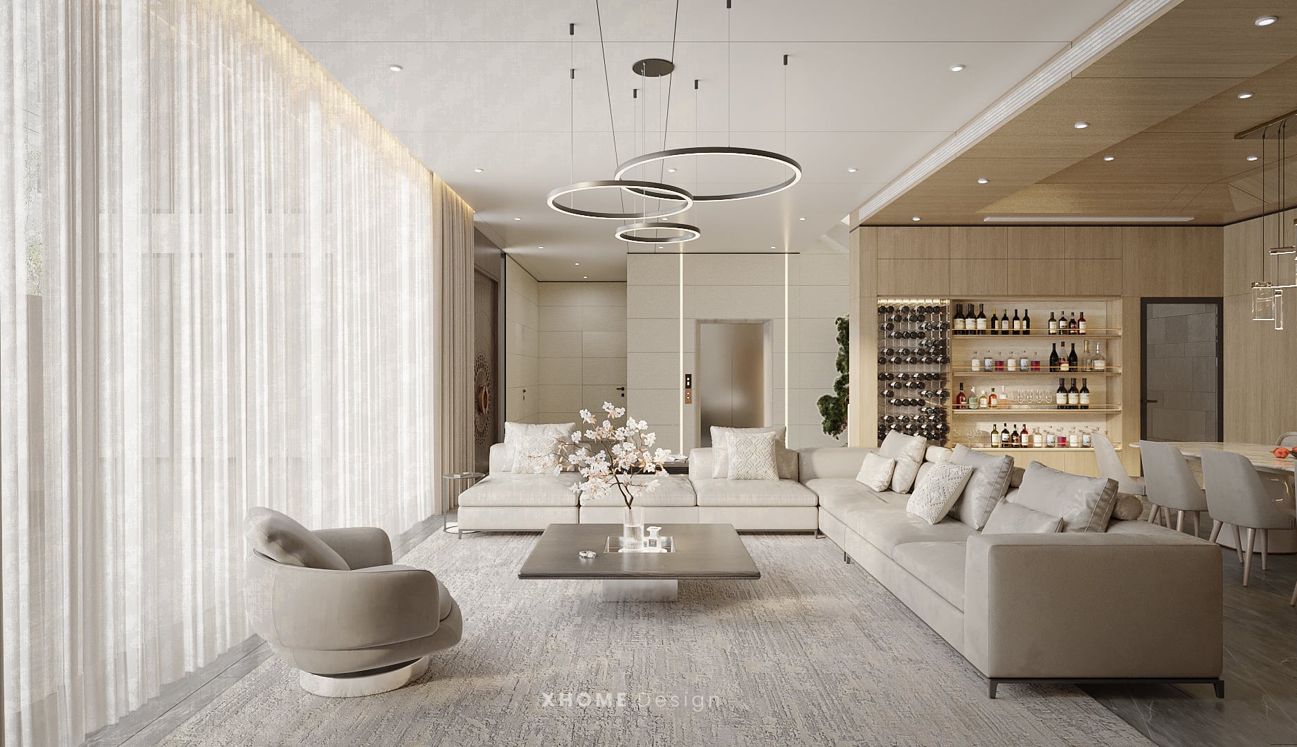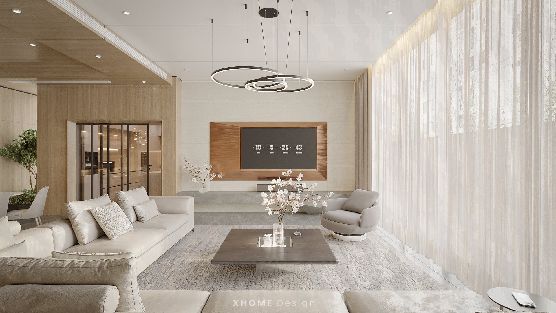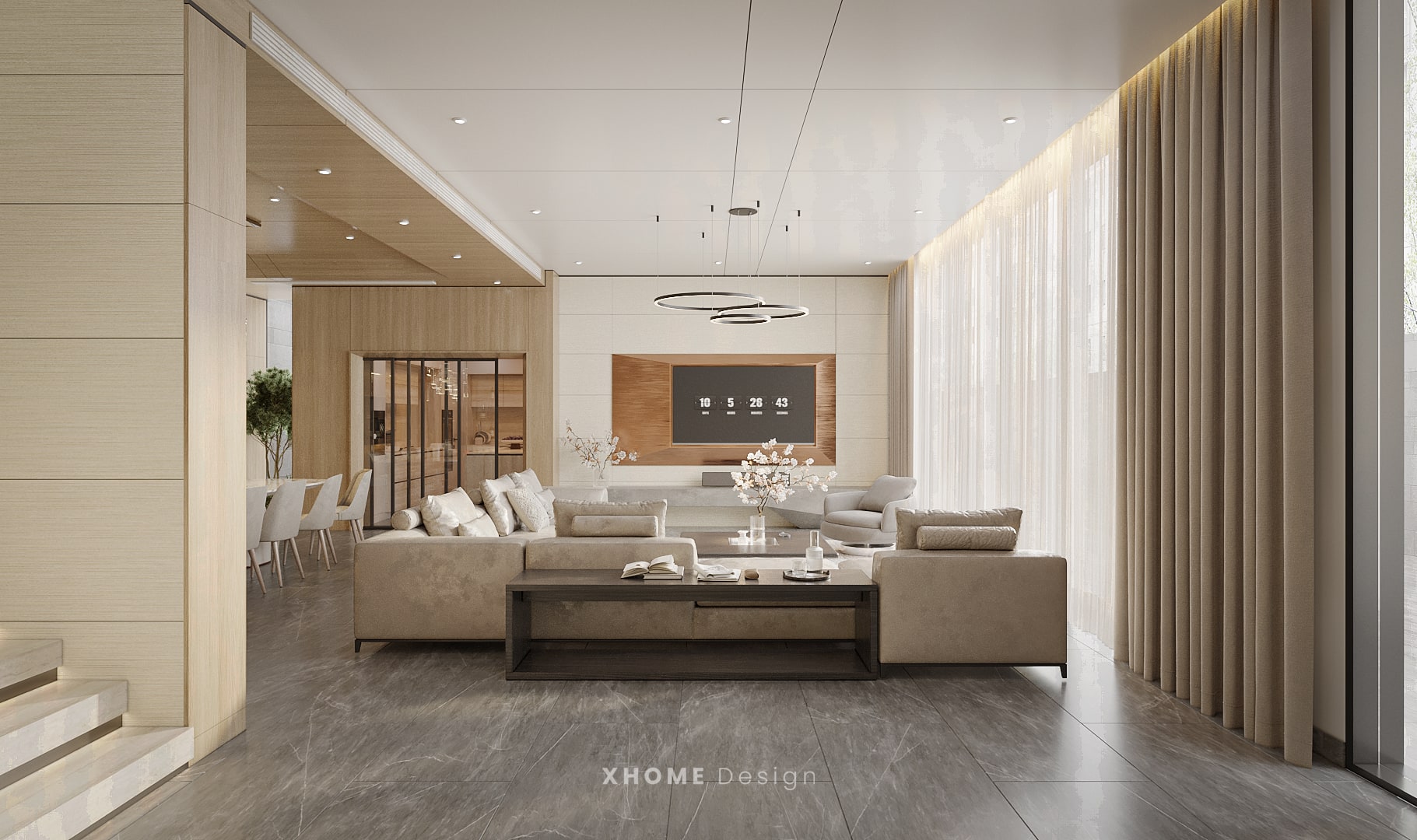 Không gian phòng khách được thiết kế theo bố cục mở, ưu tiên trục nhìn dài và khả năng đón sáng tự nhiên. Nội thất sử dụng đường nét tinh giản, hạn chế chi tiết trang trí, tập trung vào tỷ lệ khối và sự đồng bộ vật liệu. Hệ trần phẳng kết hợp chiếu sáng gián tiếp giúp không gian đạt được độ cao thị giác và cảm giác thoáng đãng.