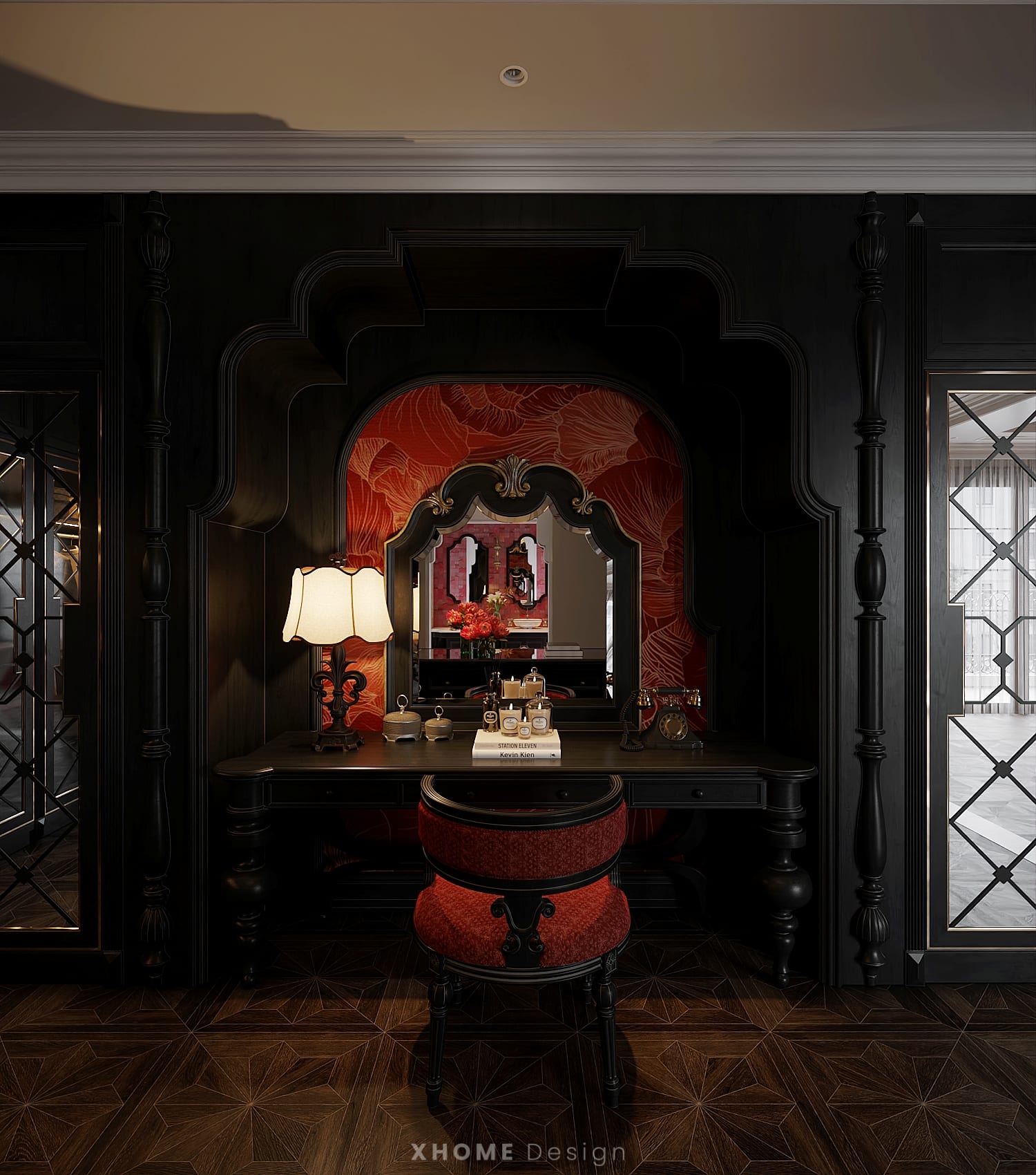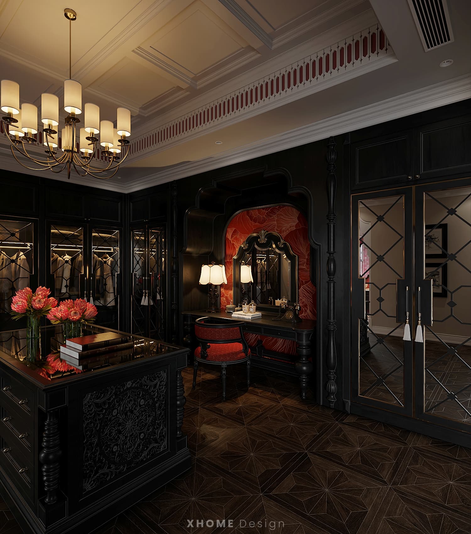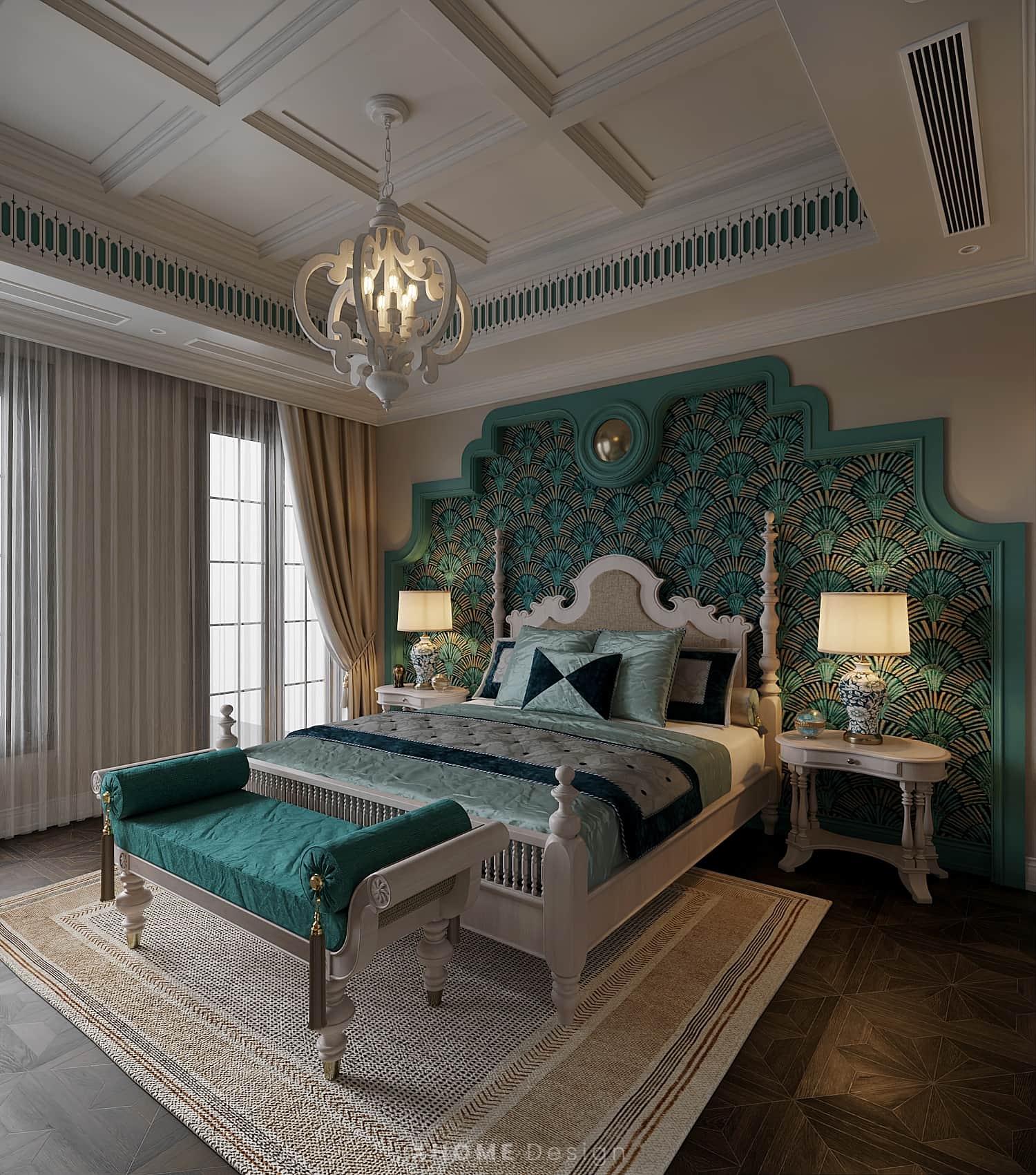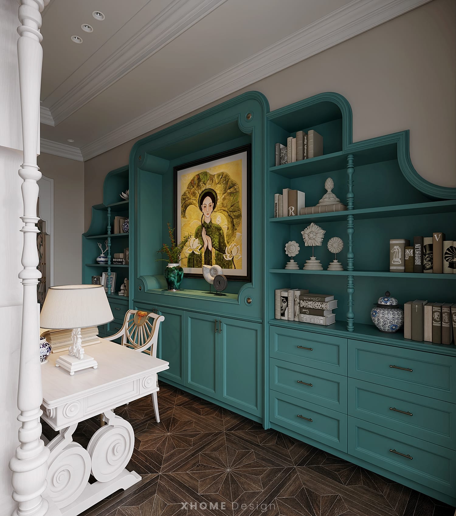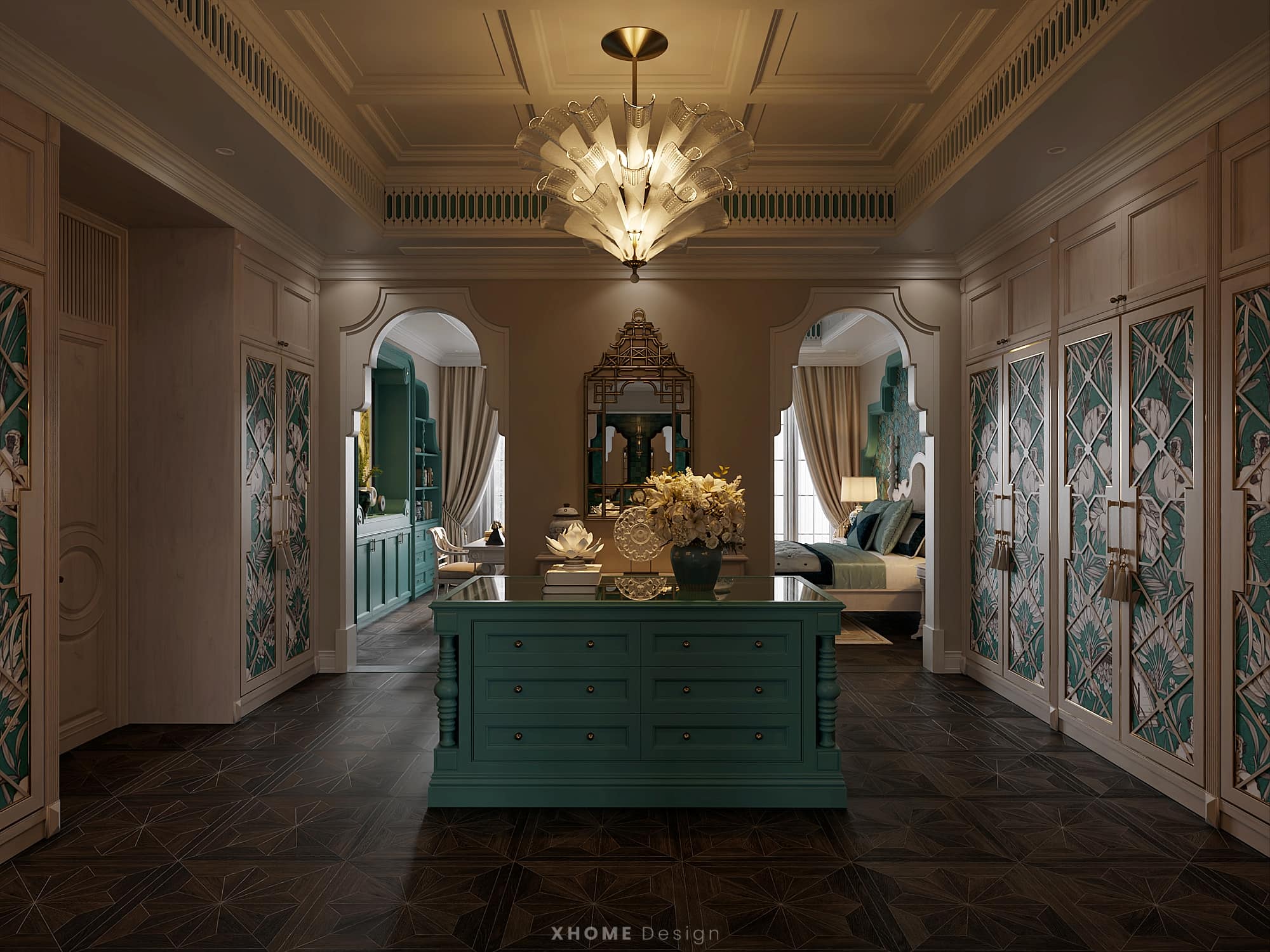Giải pháp Ánh sáng và Màu sắc: Thay vì sử dụng một tông màu duy nhất, dự án là một cuộc dạo chơi của những sắc thái màu sắc đầy chiều sâu. Phòng khách gây ấn tượng với tông nâu trầm và vàng đồng, trong khi các phòng ngủ lại chuyển mình sang sắc xanh Peacock (xanh con công) thanh lịch hoặc hồng Ruby quý phái. Hệ thống đèn chùm được thiết kế riêng với kiểu dáng mô phỏng hoa sen hoặc dải lụa mềm mại, kết hợp với đèn tường đồng thau tạo nên hiệu ứng ánh sáng ấm, tôn lên các đường phào chỉ chạy dọc trên trần và tường.