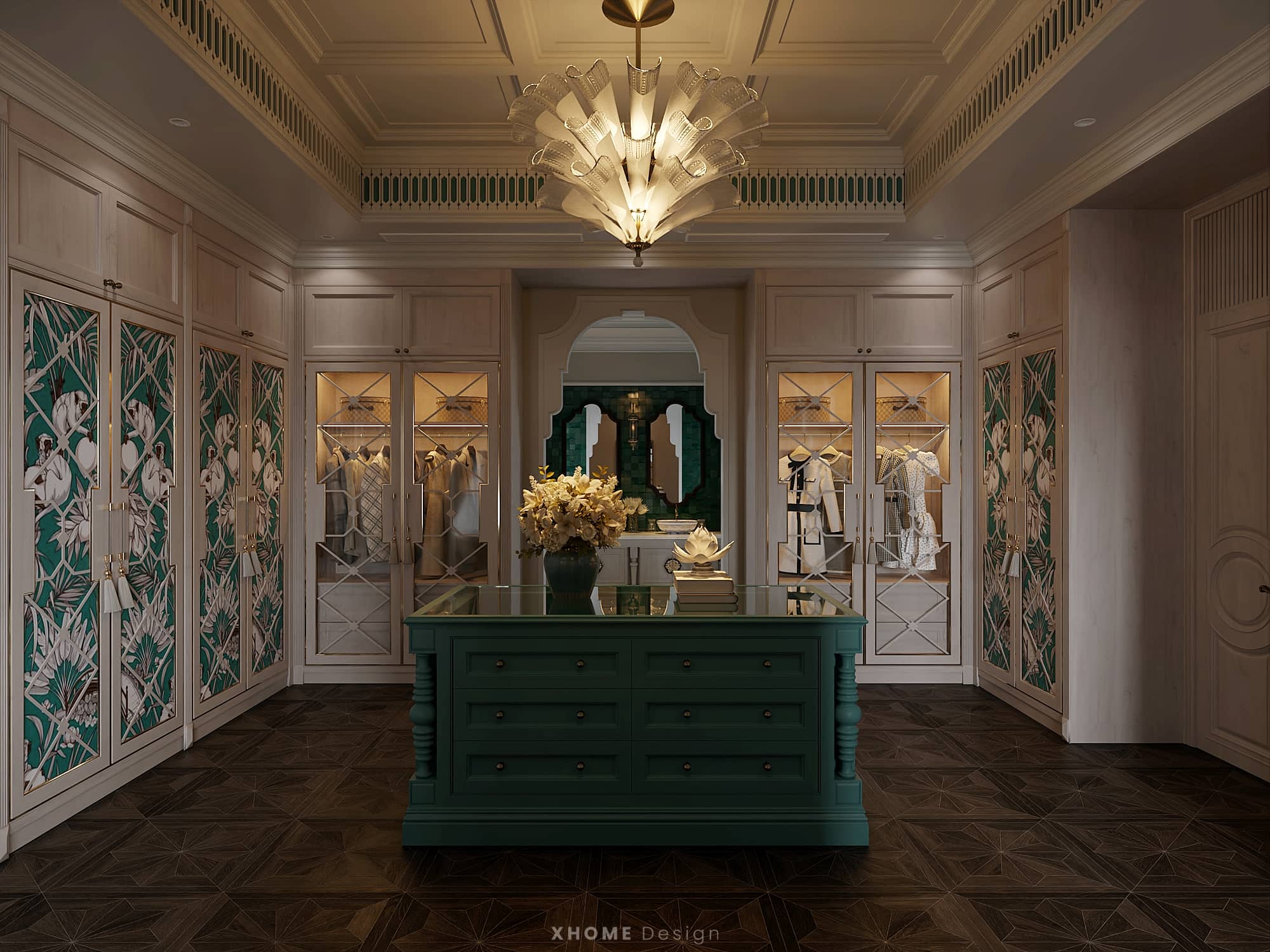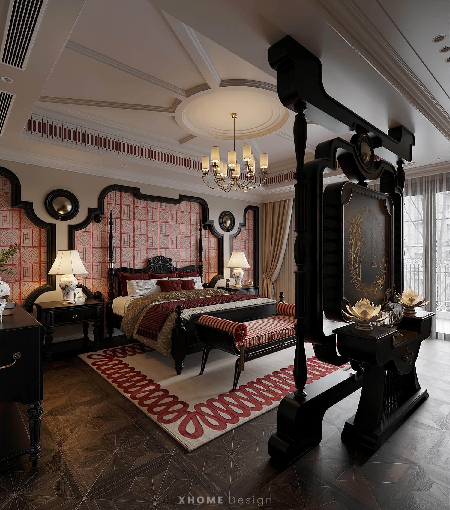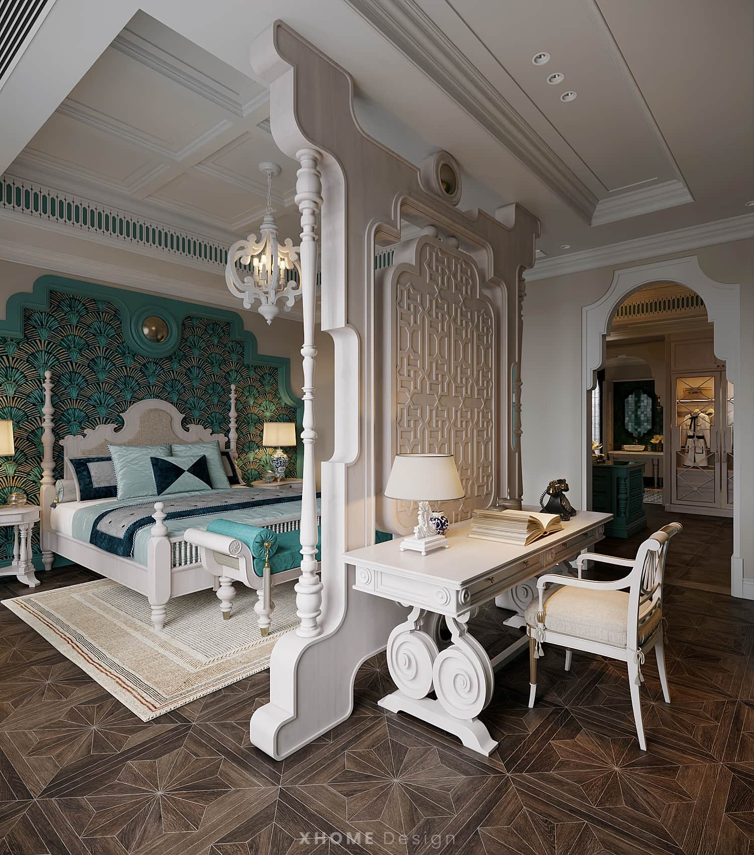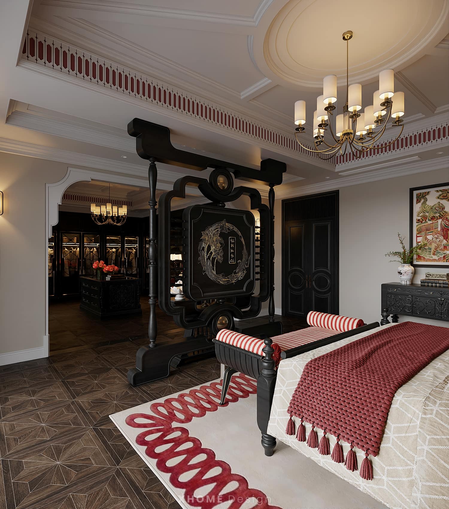 Giải pháp Ánh sáng và Màu sắc: Thay vì sử dụng một tông màu duy nhất, dự án là một cuộc dạo chơi của những sắc thái màu sắc đầy chiều sâu. Phòng khách gây ấn tượng với tông nâu trầm và vàng đồng, trong khi các phòng ngủ lại chuyển mình sang sắc xanh Peacock (xanh con công) thanh lịch hoặc hồng Ruby quý phái. Hệ thống đèn chùm được thiết kế riêng với kiểu dáng mô phỏng hoa sen hoặc dải lụa mềm mại, kết hợp với đèn tường đồng thau tạo nên hiệu ứng ánh sáng ấm, tôn lên các đường phào chỉ chạy dọc trên trần và tường.
