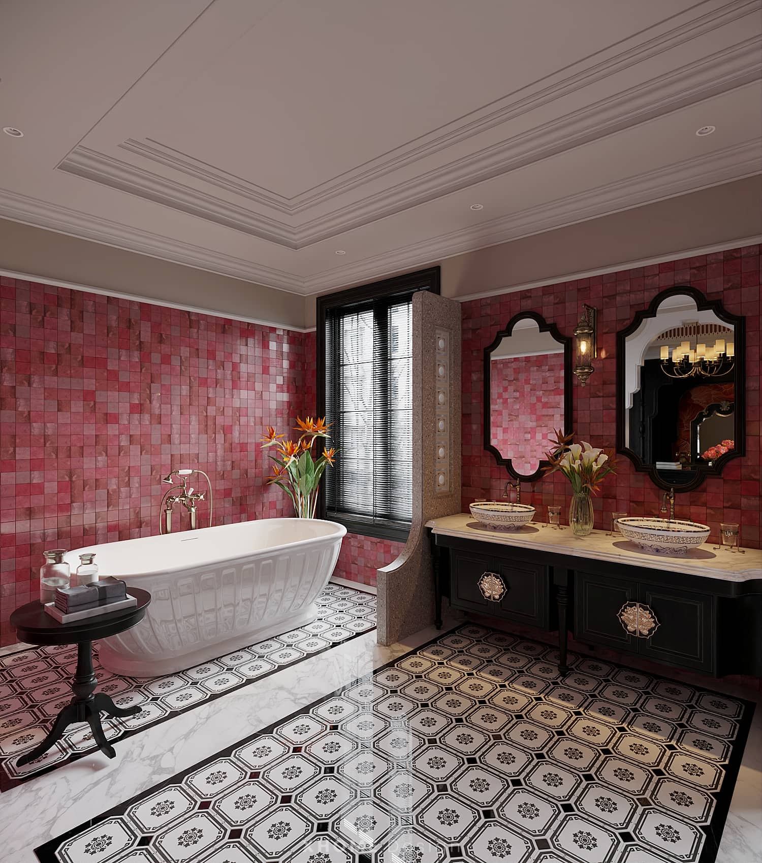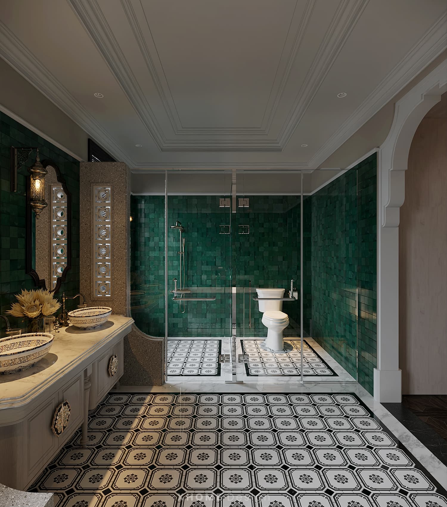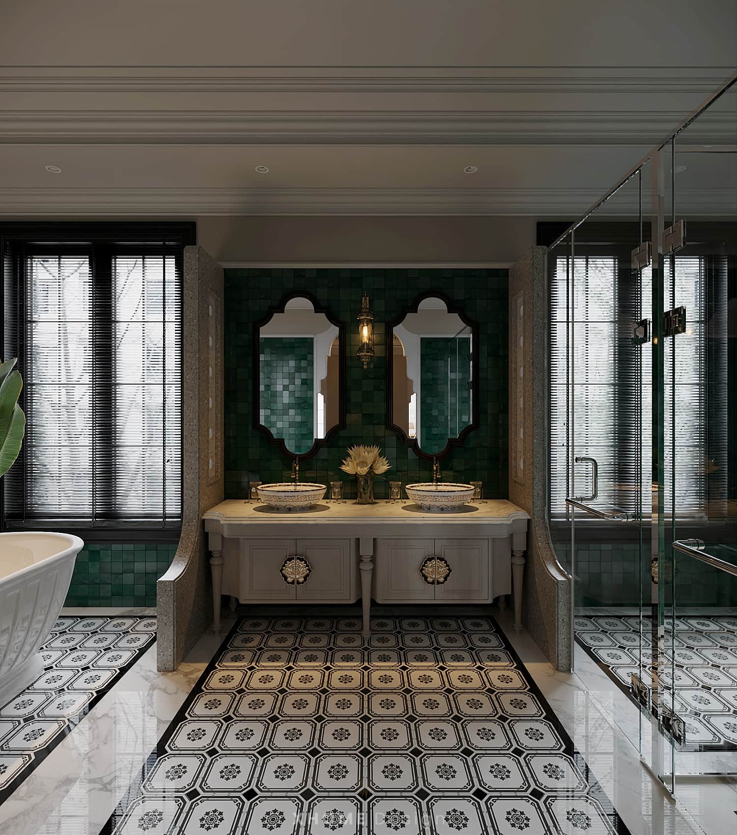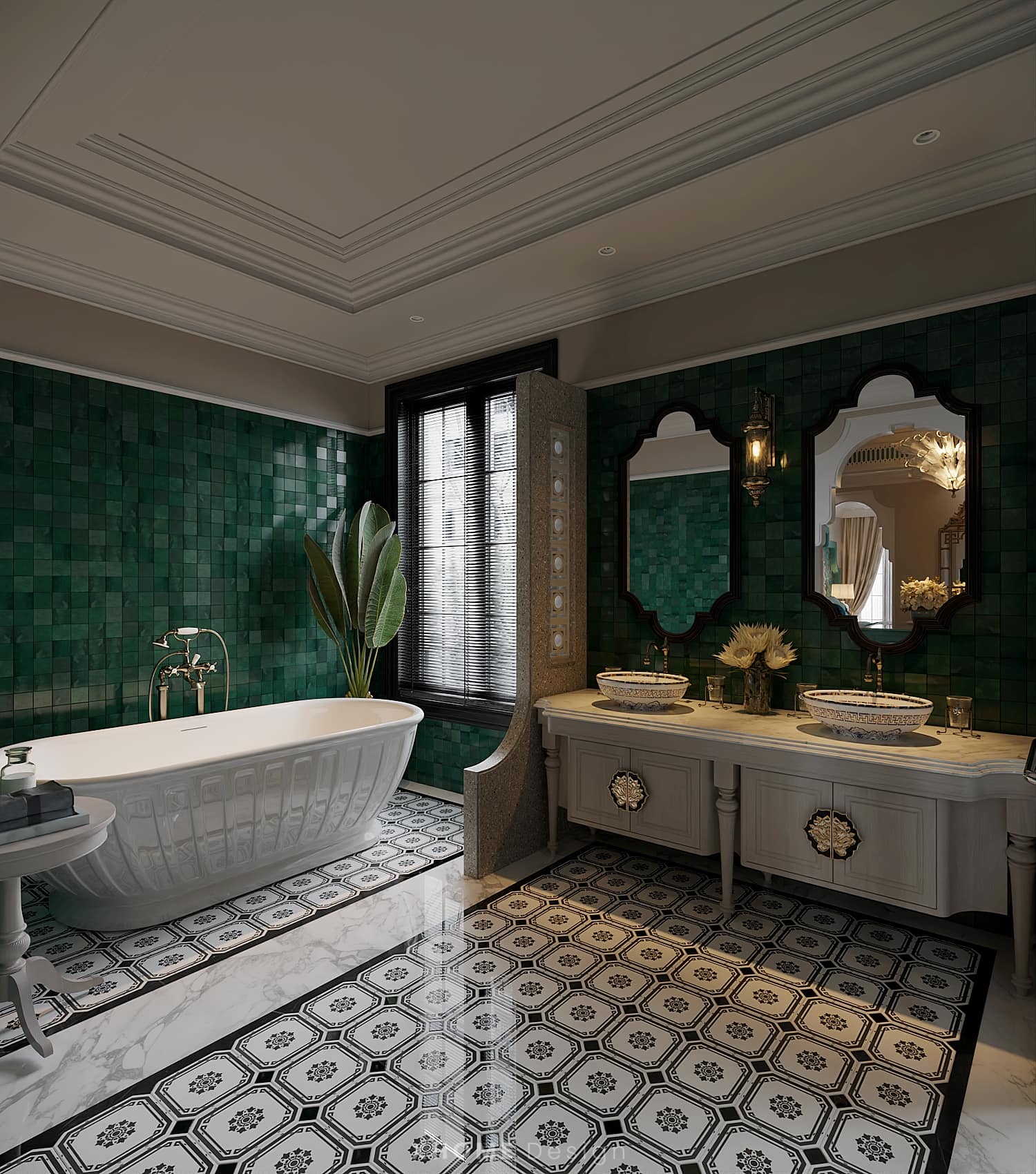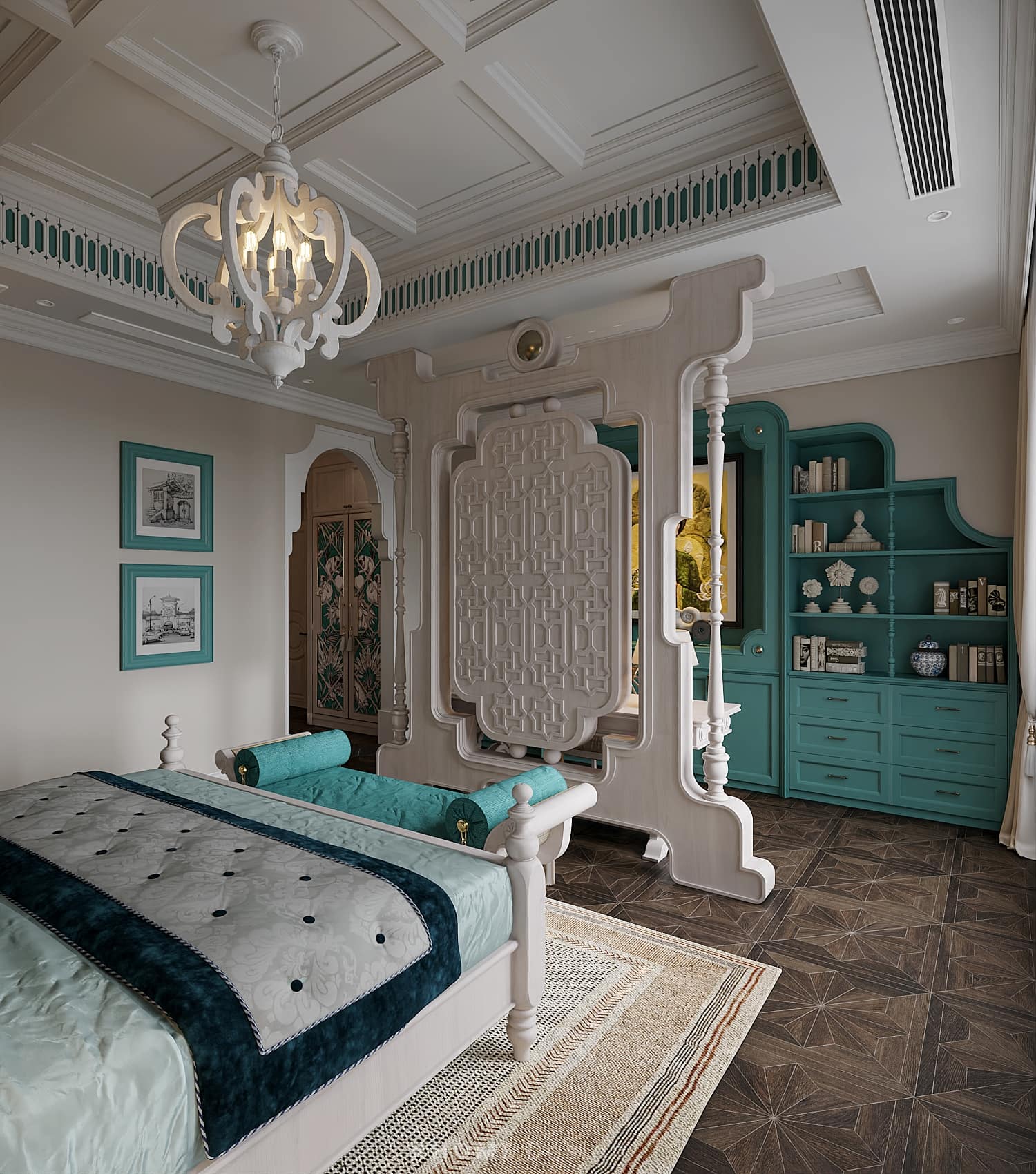 Giải pháp Ánh sáng và Màu sắc: Thay vì sử dụng một tông màu duy nhất, dự án là một cuộc dạo chơi của những sắc thái màu sắc đầy chiều sâu. Phòng khách gây ấn tượng với tông nâu trầm và vàng đồng, trong khi các phòng ngủ lại chuyển mình sang sắc xanh Peacock (xanh con công) thanh lịch hoặc hồng Ruby quý phái. Hệ thống đèn chùm được thiết kế riêng với kiểu dáng mô phỏng hoa sen hoặc dải lụa mềm mại, kết hợp với đèn tường đồng thau tạo nên hiệu ứng ánh sáng ấm, tôn lên các đường phào chỉ chạy dọc trên trần và tường.