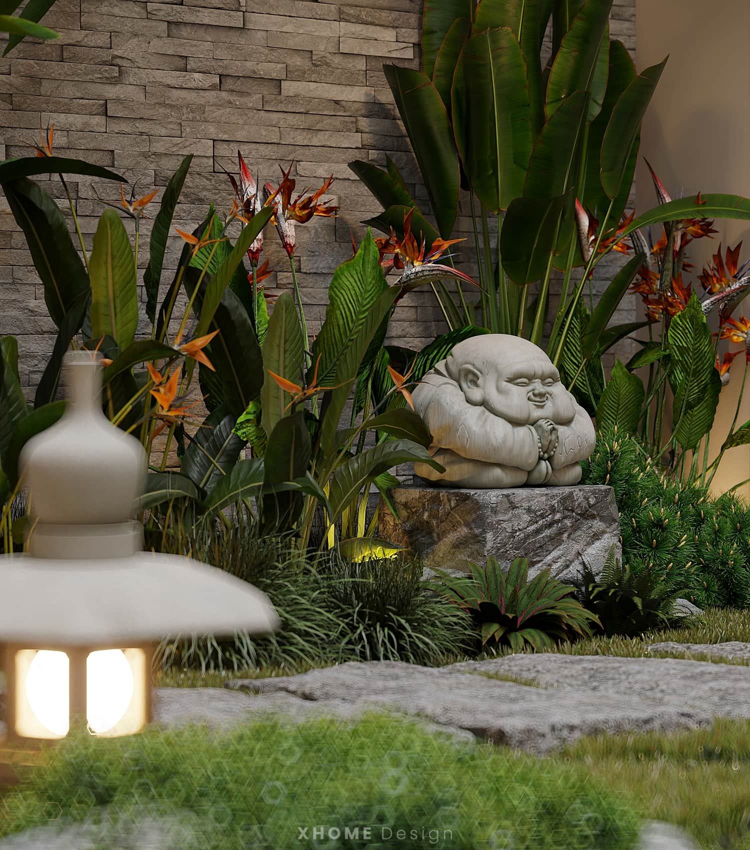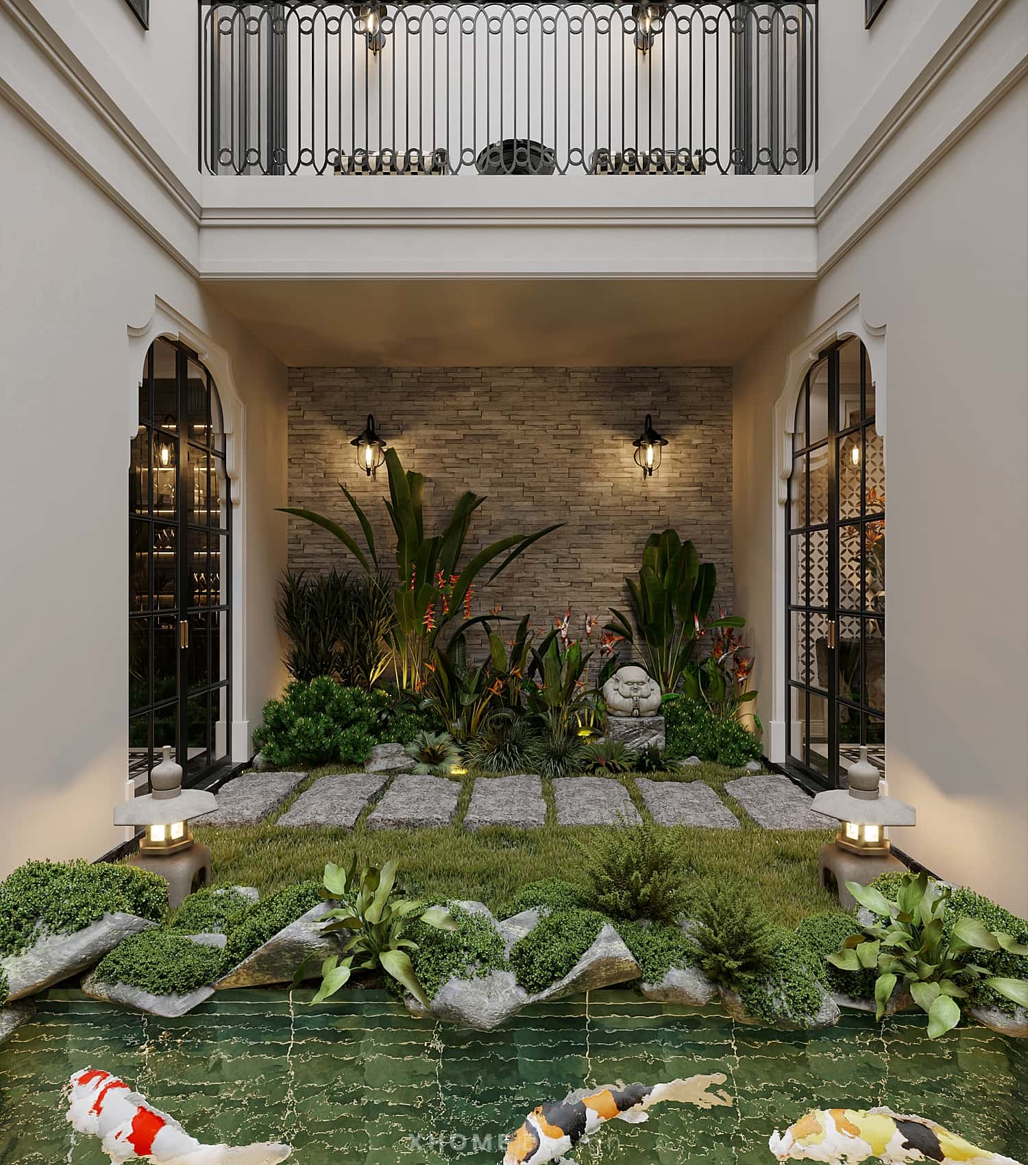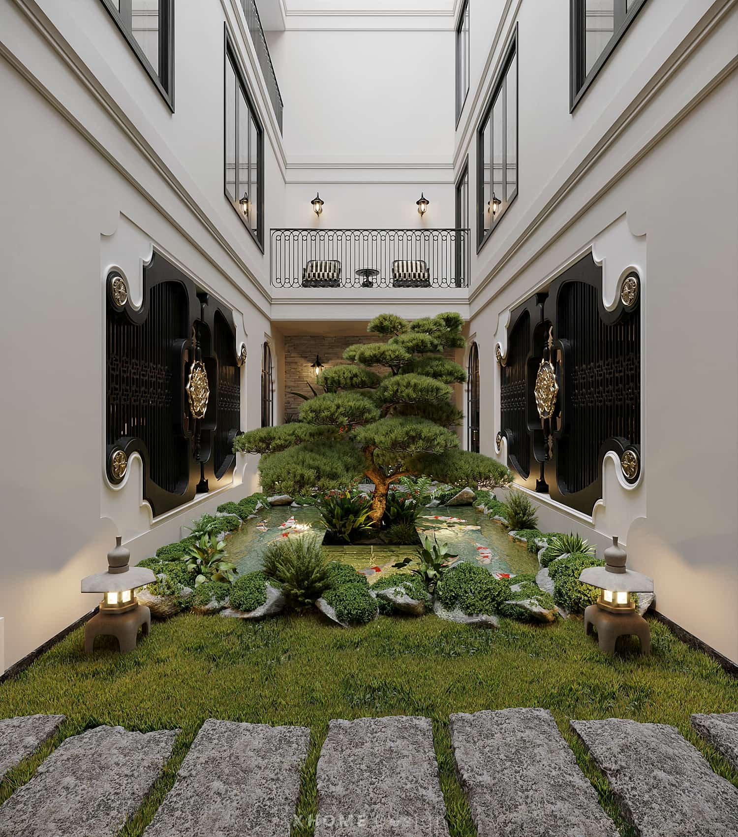 Với phong cách Indochine (Đông Dương) làm chủ đạo, dự án mang đến một hơi thở đầy hoài niệm nhưng không kém phần tiện nghi, hiện đại. Ngay từ sảnh vào, sự kết hợp giữa kiến trúc thông tầng và hệ giếng trời đã tạo nên một không gian mở tràn ngập ánh sáng tự nhiên. Điểm nhấn đặc biệt nhất trong tổng quan kiến trúc chính là khu vườn tiểu cảnh nằm ngay trung tâm ngôi nhà, nơi có hồ cá Koi uốn lượn và cây bonsai dáng trực, tạo nên một sự kết nối hoàn hảo giữa con người và thiên nhiên. Sự tinh tế trong việc sắp đặt bố cục giúp mỗi góc nhỏ trong biệt thự đều trở thành một khung hình đậm chất điện ảnh, thể hiện gu thẩm mỹ thượng lưu và tâm hồn yêu nghệ thuật của gia chủ.