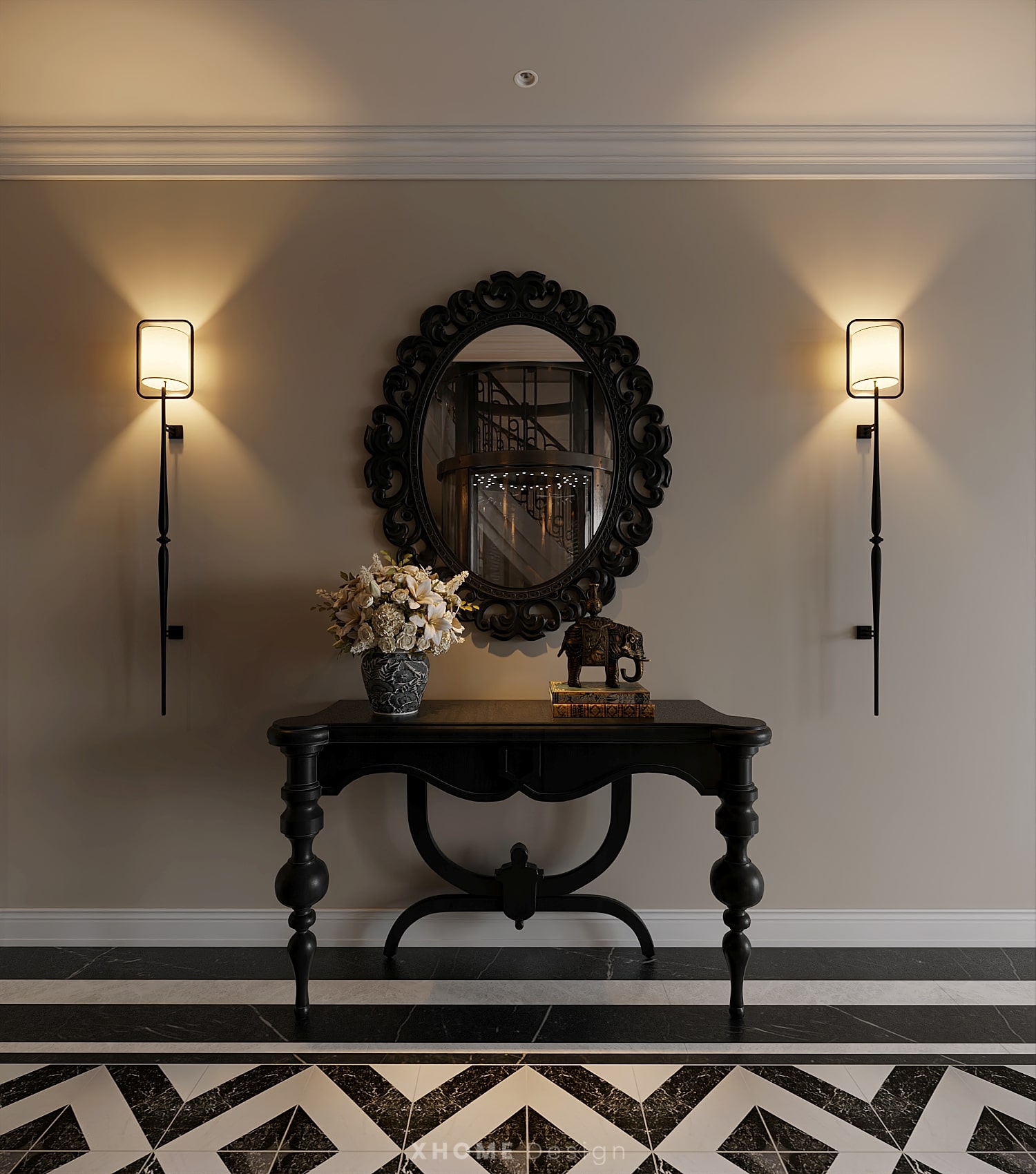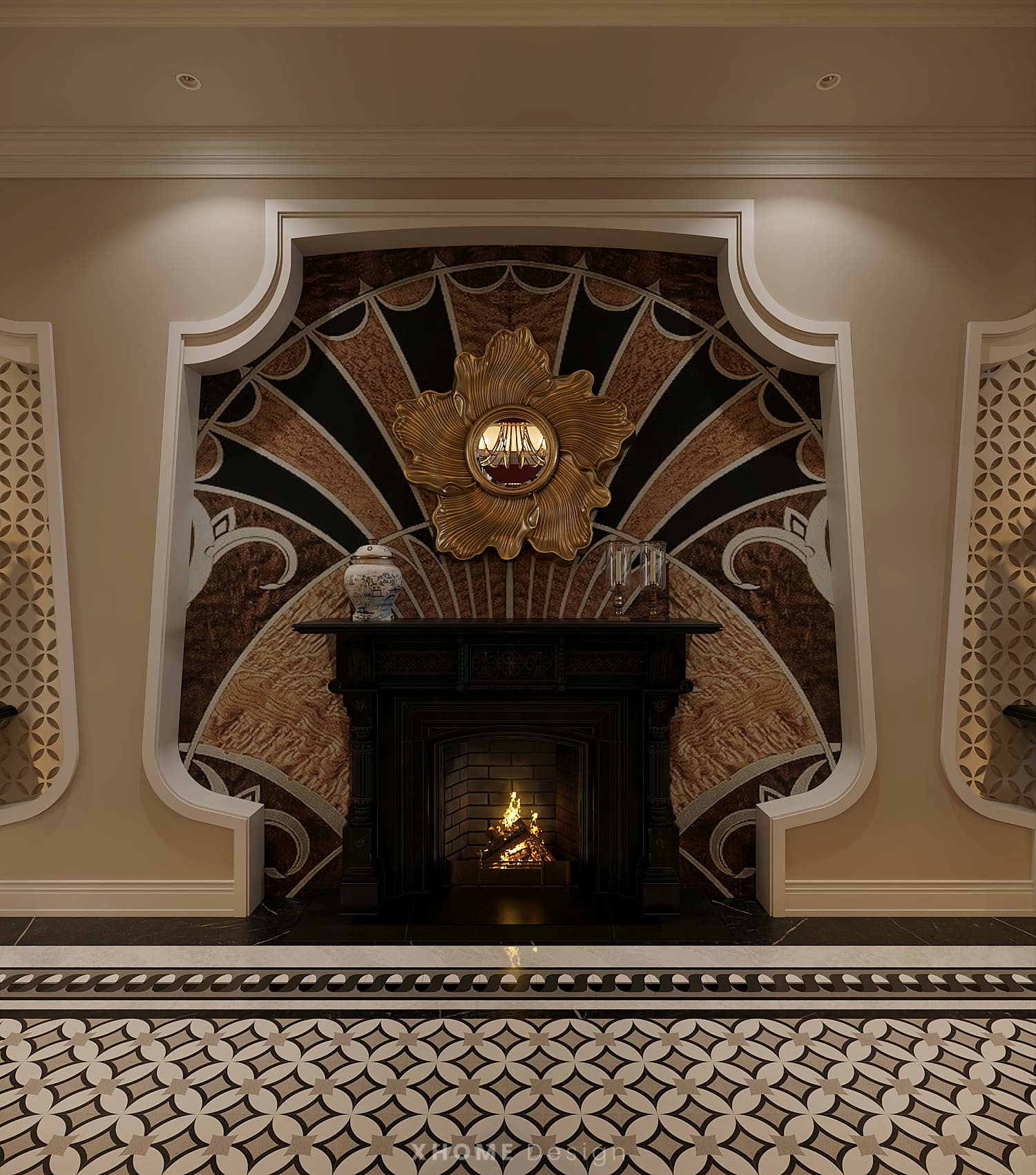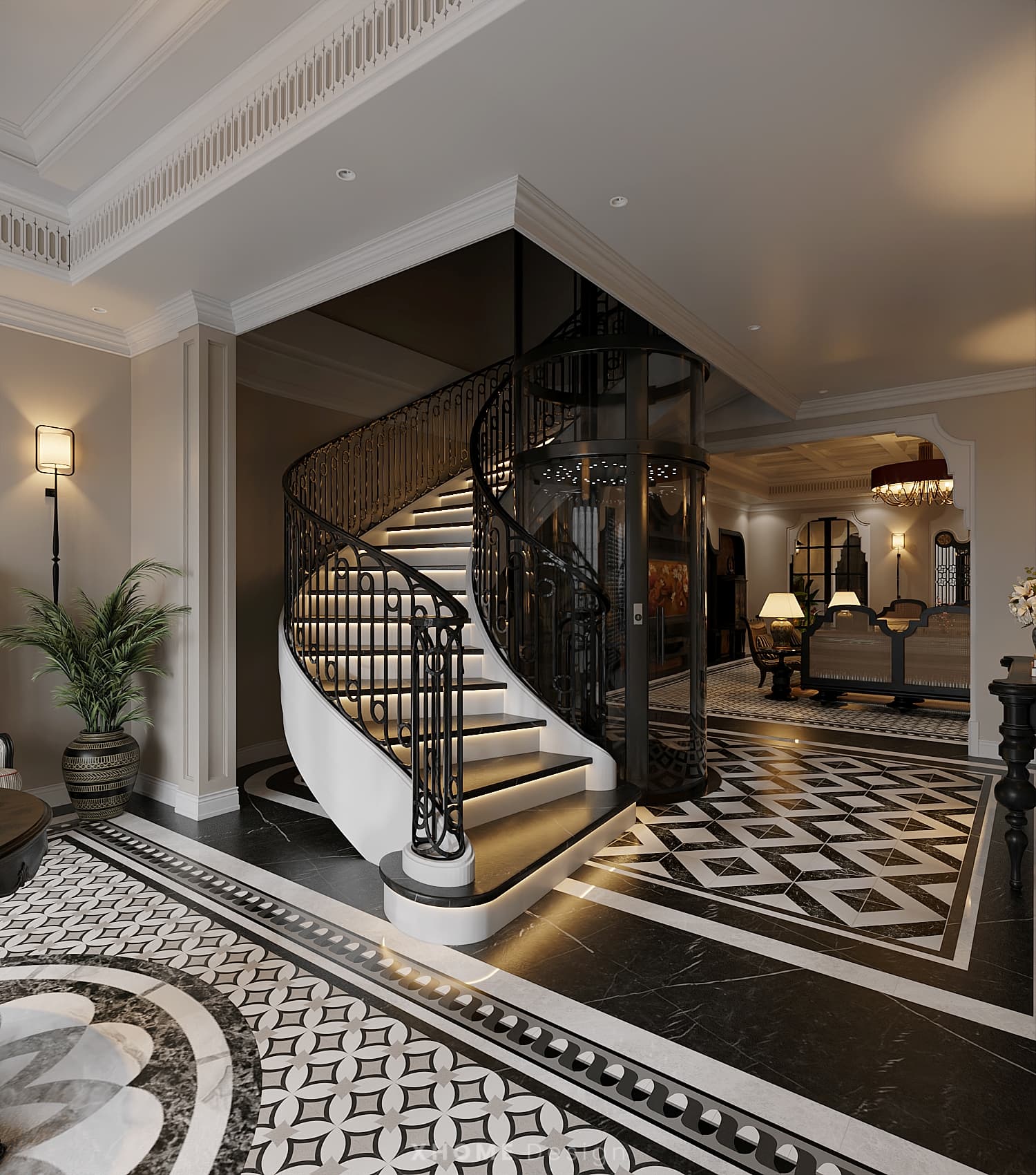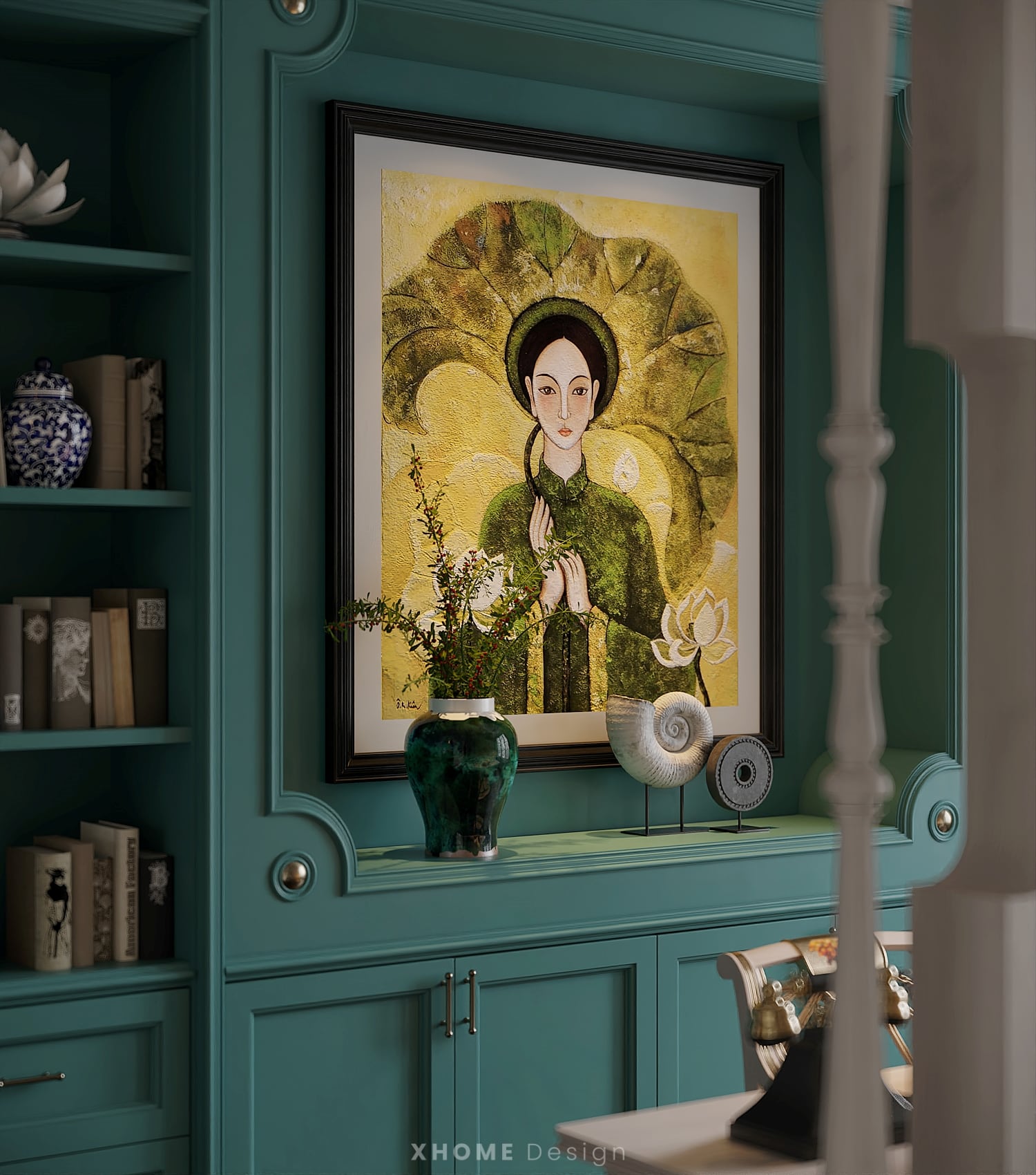 Nội thất và Đồ Decor: Mỗi món đồ trong thiết kế nội thất biệt thự này đều được “may đo” riêng. Từ những chiếc ghế bành có đường cong uốn lượn phong cách Louis, cho đến vách ngăn gỗ CNC chạm khắc họa tiết Kỷ Hà tỉ mỉ. Các mảng tường không để trống mà được điểm xuyết bằng những bức tranh sơn mài khổ lớn về chủ đề phụ nữ Việt Nam hay linh vật truyền thống, cùng hệ thống bình gốm sứ thủ công được sắp đặt có tính toán, tạo nên một không gian trưng bày nghệ thuật đầy lôi cuốn.