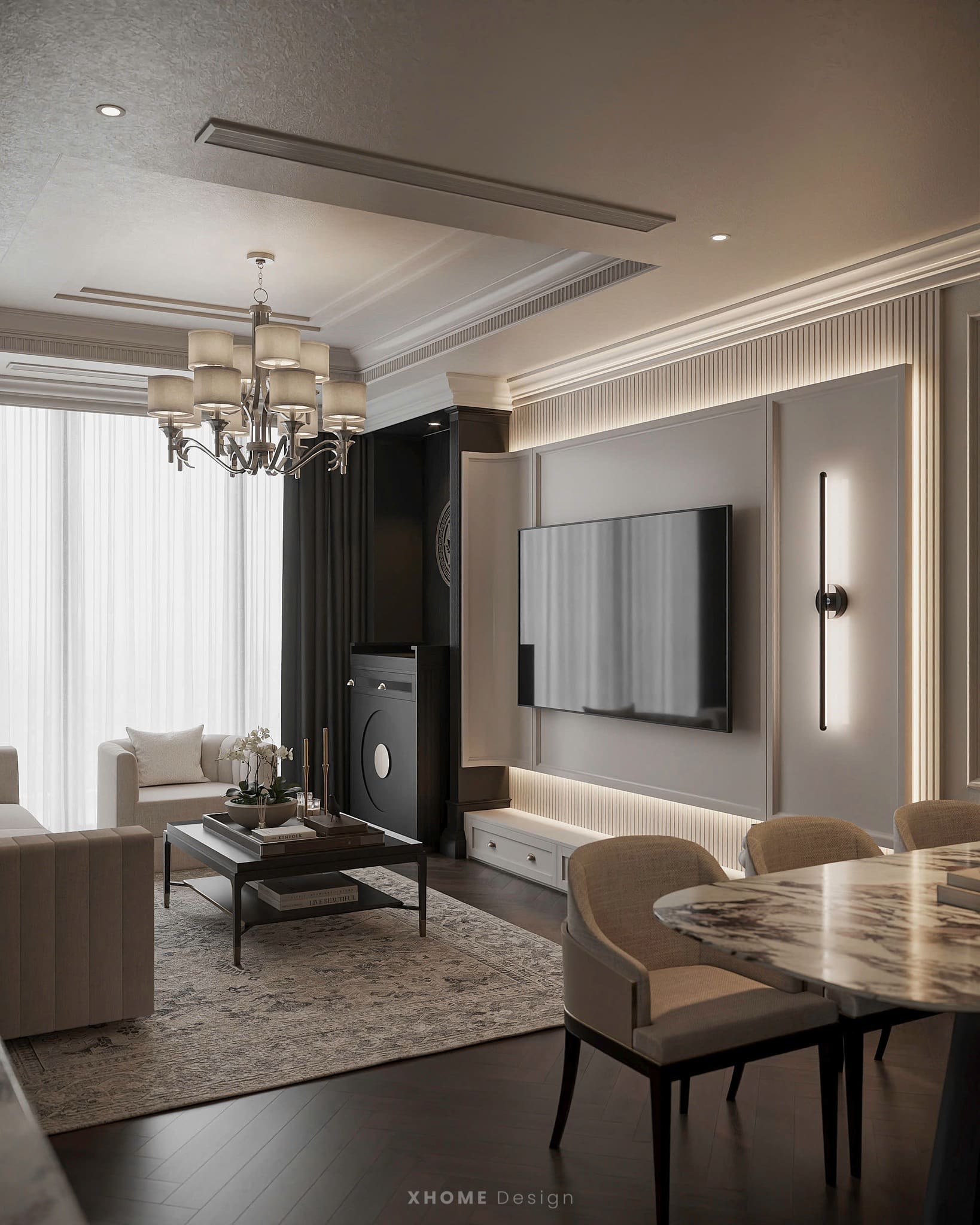 Dự án mang phong cách Tân cổ điển sang trọng, tinh tế, thể hiện qua từng chi tiết nội thất và bố cục hài hòa, tạo nên không gian sống đẳng cấp, tiện nghi và đầy cảm hứng.