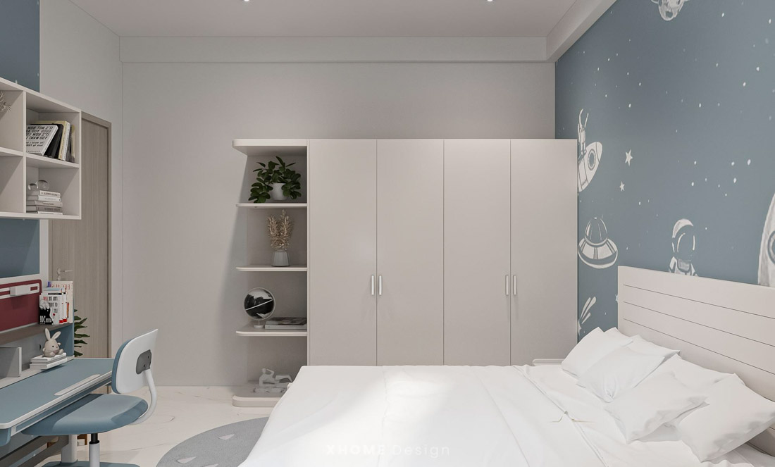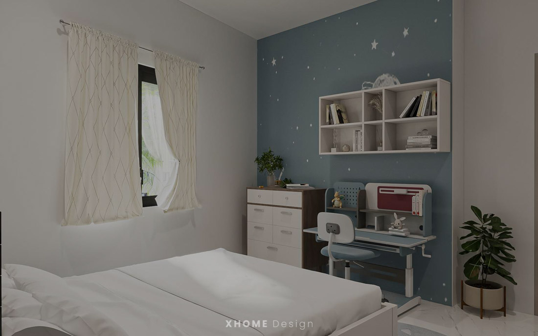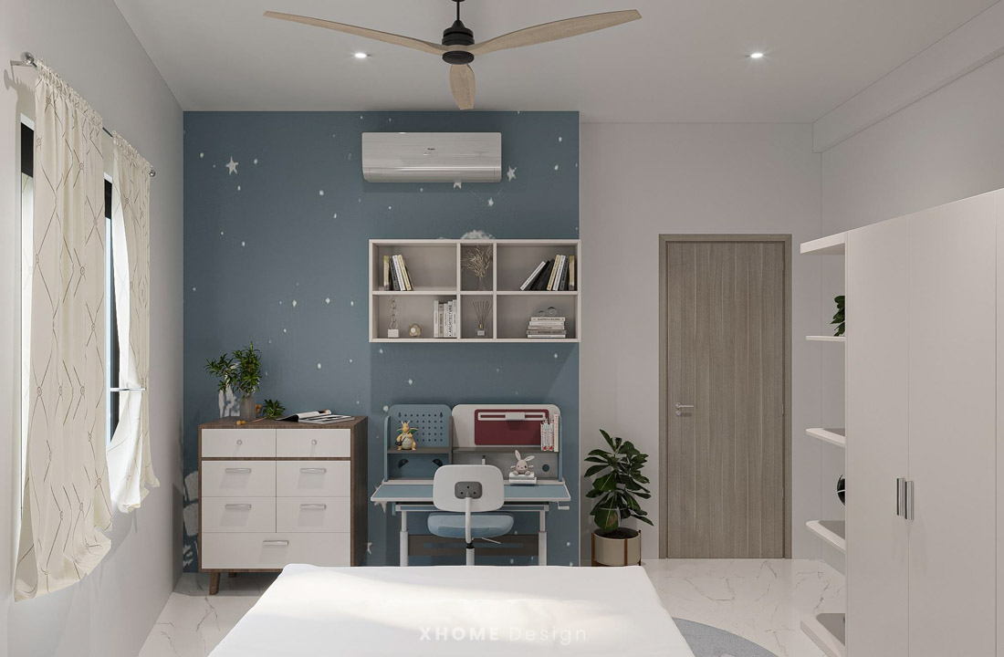 Ở tầng lửng, gia chủ có thể tận dụng không gian này để tạo một góc làm việc yên tĩnh hoặc phòng sinh hoạt chung. Trên tầng lầu, chúng tôi thiết kế 2 phòng ngủ, 1 phòng ngủ master và 1 phòng ngủ nhỏ mang lại không gian nghỉ ngơi thoải mái với giường ngủ lớn, tủ quần áo âm tường và bàn trang điểm, kết hợp phòng tắm và nhà vệ sinh trong phòng ngủ tạo sự tiện nghi và riêng tư.