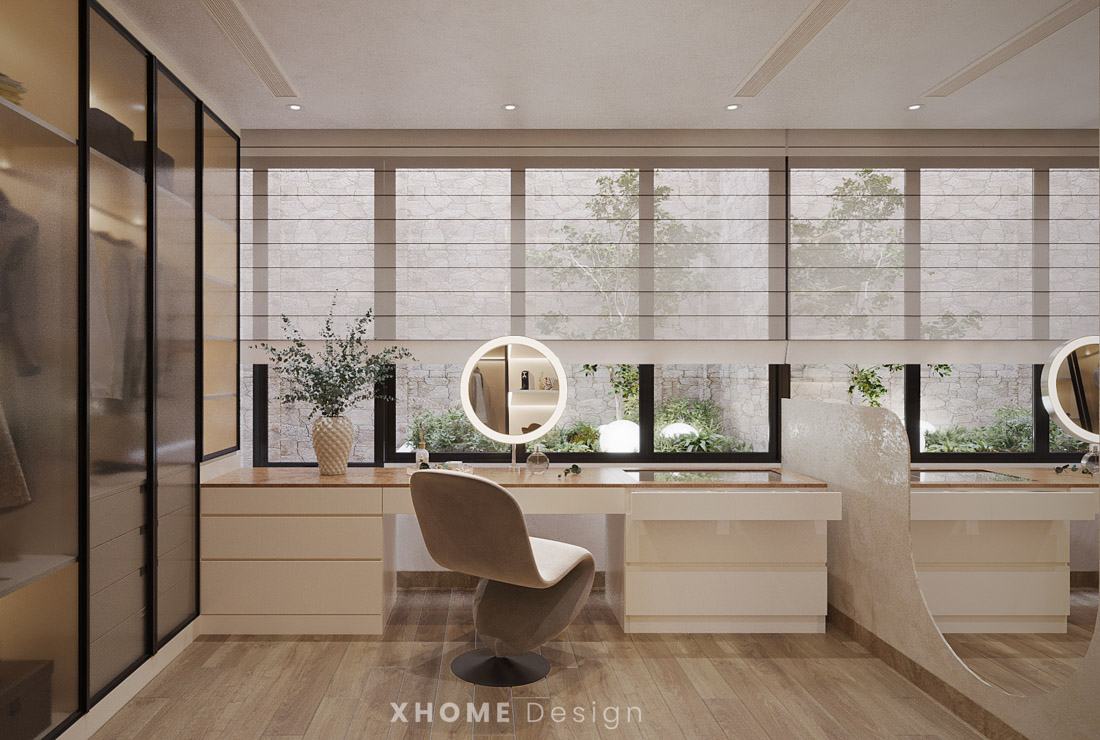 Dự án Vu House được thiết kế với không gian mở, tràn đầy ánh sáng tự nhiên và sử dụng các tông màu sáng như trắng, kem, be và đen. Các vật liệu như gỗ tự nhiên, đá cẩm thạch và vải mềm mại được sử dụng để tạo nên một không gian ấm áp và gần gũi.