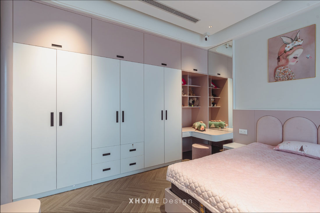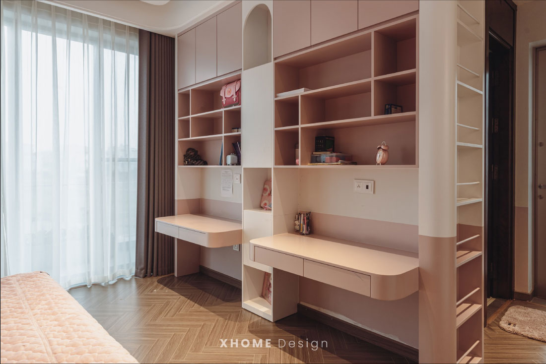 Hai phòng ngủ của bé trai và bé gái được thiết kế hiện đại, cá nhân hóa theo sở thích và giới tính. Phòng bé gái nhẹ nhàng với gam hồng pastel và chi tiết bo cong mềm mại mang đến cảm giác dịu dàng, ấm áp. Phòng bé trai sử dụng tông xanh navy – trắng mạnh mẽ, nhấn bằng bản đồ thế giới gỗ khơi gợi tư duy khám phá. Mỗi phòng đều tích hợp bàn học, tủ lưu trữ thông minh và tận dụng ánh sáng tự nhiên, tạo không gian lý tưởng để bé học tập, nghỉ ngơi và phát triển toàn diện.