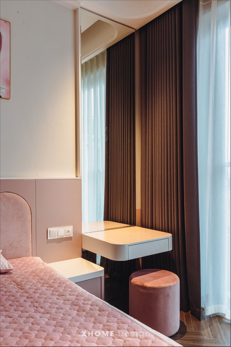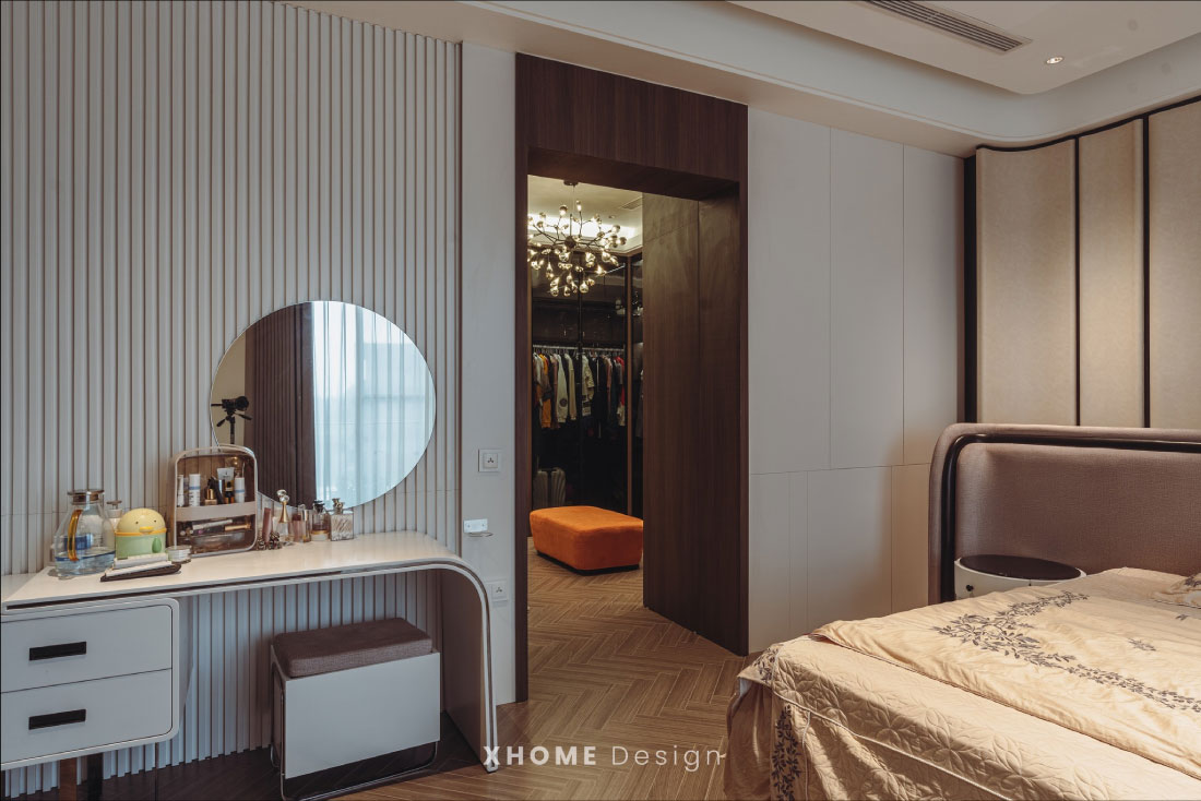 Phòng ngủ master mang đến cảm giác thư giãn và cao cấp với gam màu trung tính ấm áp, nhấn nhá bằng vách đầu giường bọc nỉ bo cong mềm mại. Giường ngủ lớn cùng bộ chăn ga đồng bộ tạo sự ấm cúng, trong khi bàn trang điểm và không gian thay đồ liên thông giúp tối ưu tiện nghi. Tủ quần áo cánh kính đen viền kim loại kết hợp đèn LED âm tủ hiện đại, tạo điểm nhấn sang trọng cho toàn bộ không gian.