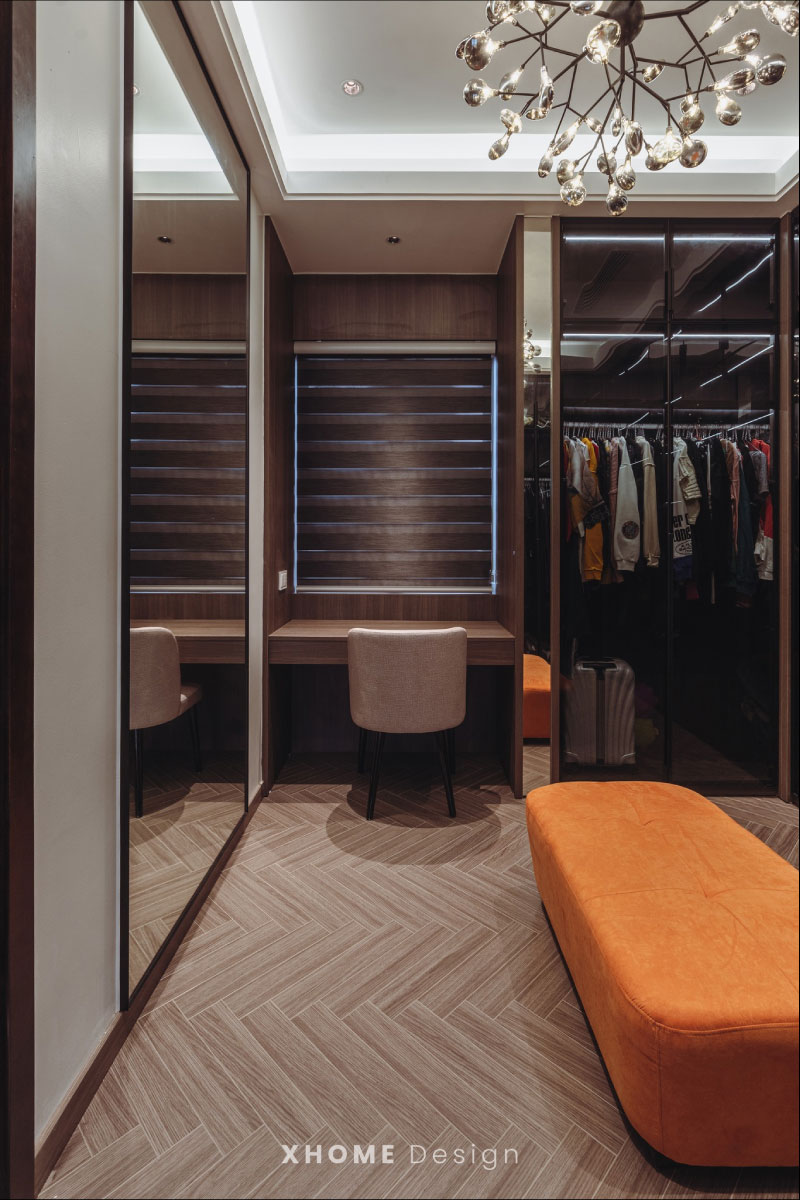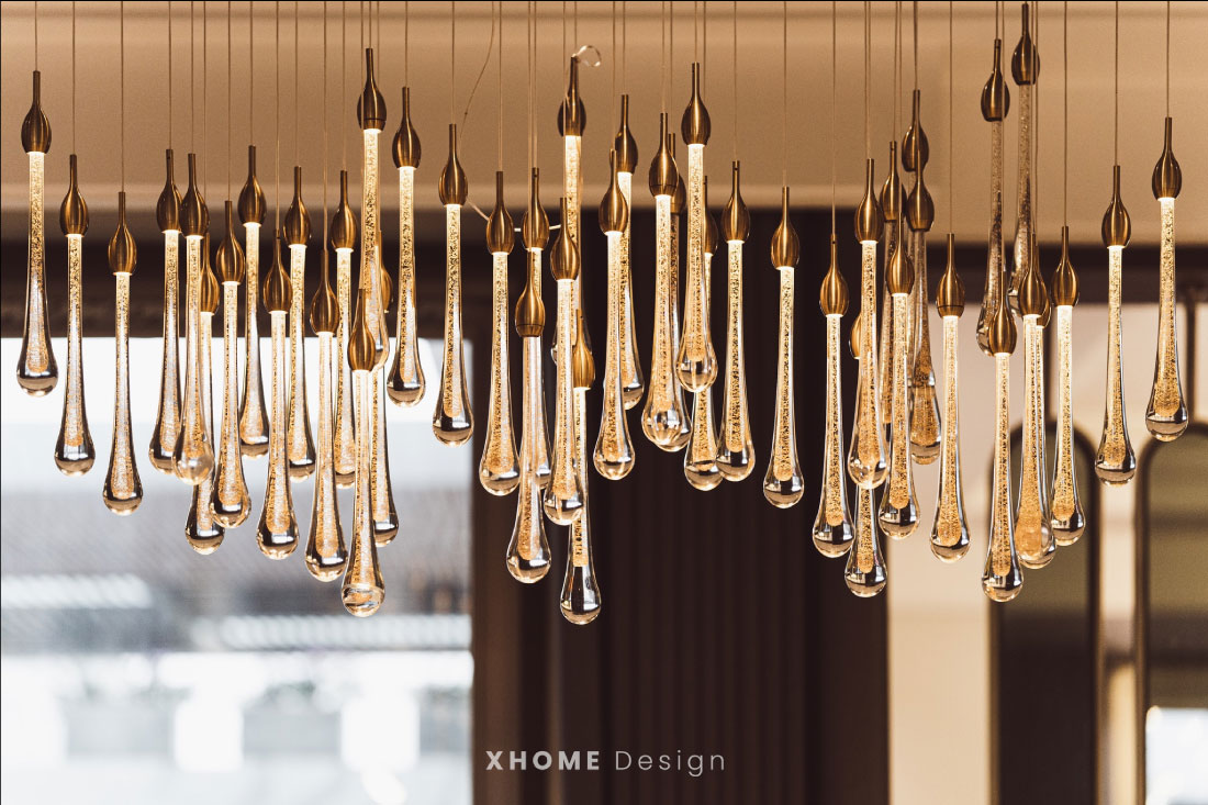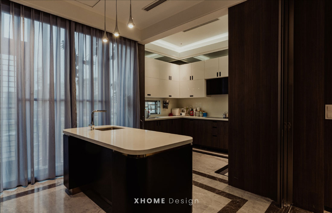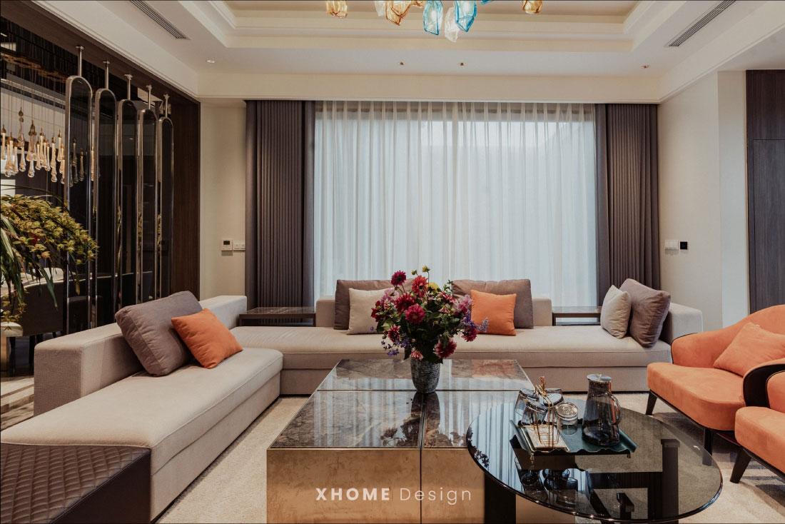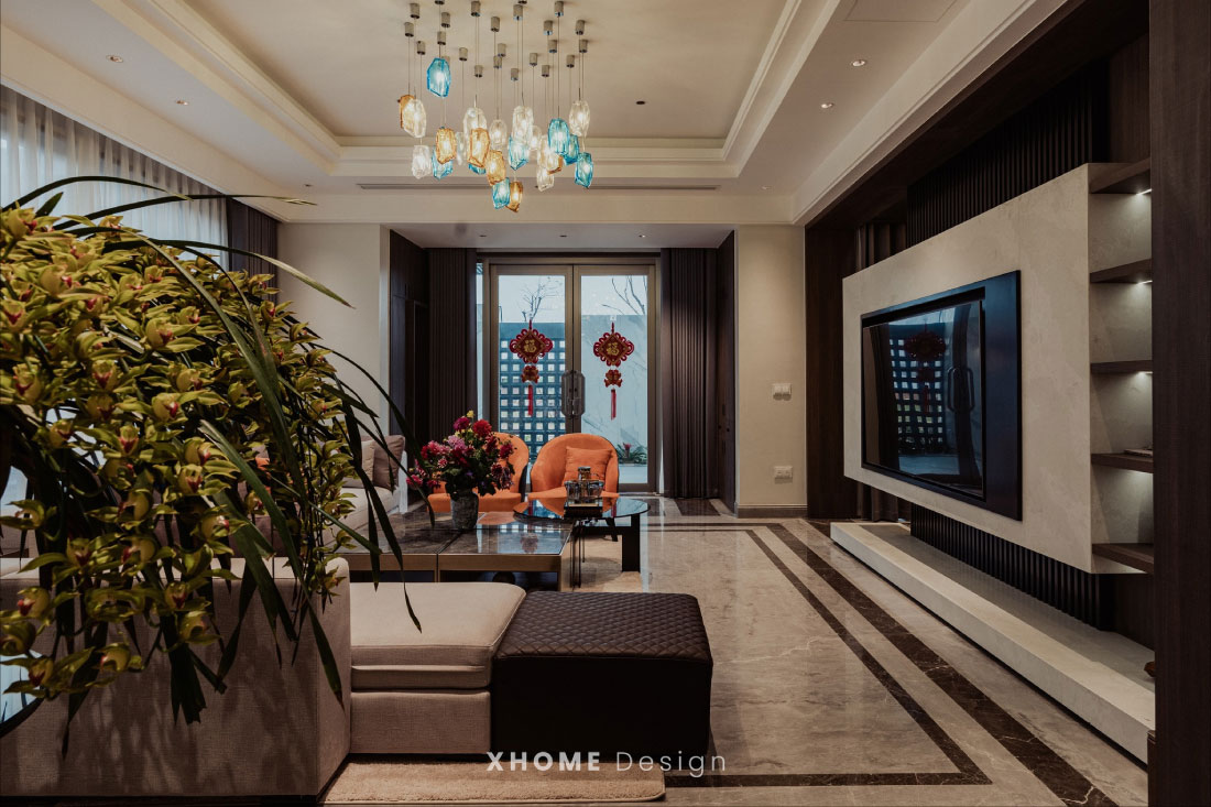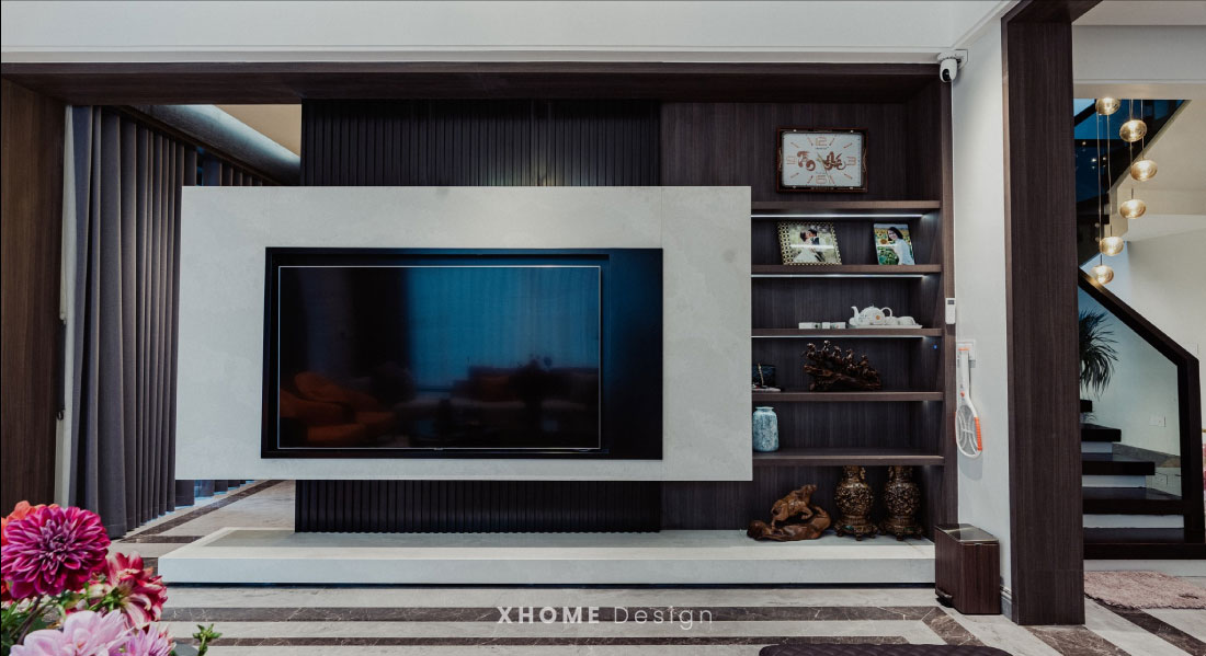 Tổng thể thiết kế mang phong cách Hiện đại, thể hiện qua cách bố trí mở, đường nét vuông vức, sử dụng vật liệu cao cấp như đá tự nhiên, gỗ vân nâu, kim loại và kính. Đặc biệt, XHOME đã khéo léo lồng ghép những yếu tố mang hơi thở Indochine nhẹ nhàng như: bình gốm cổ, lọ hoa thủ công, hệ vách gỗ sau TV với cấu trúc sọc đứng, cùng kệ trưng bày mang tính thẩm mỹ Á Đông. Những chi tiết này góp phần tạo nên bản sắc riêng biệt, vừa thanh lịch, vừa gần gũi với văn hóa truyền thống.