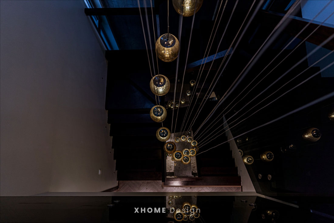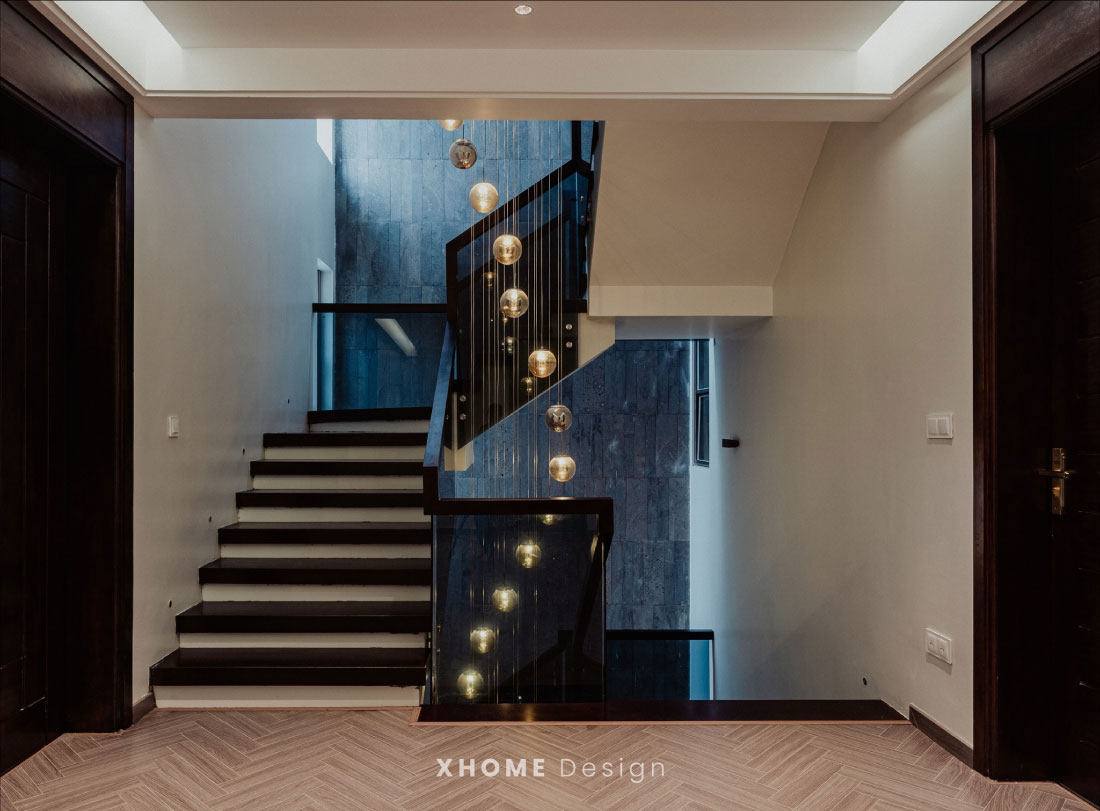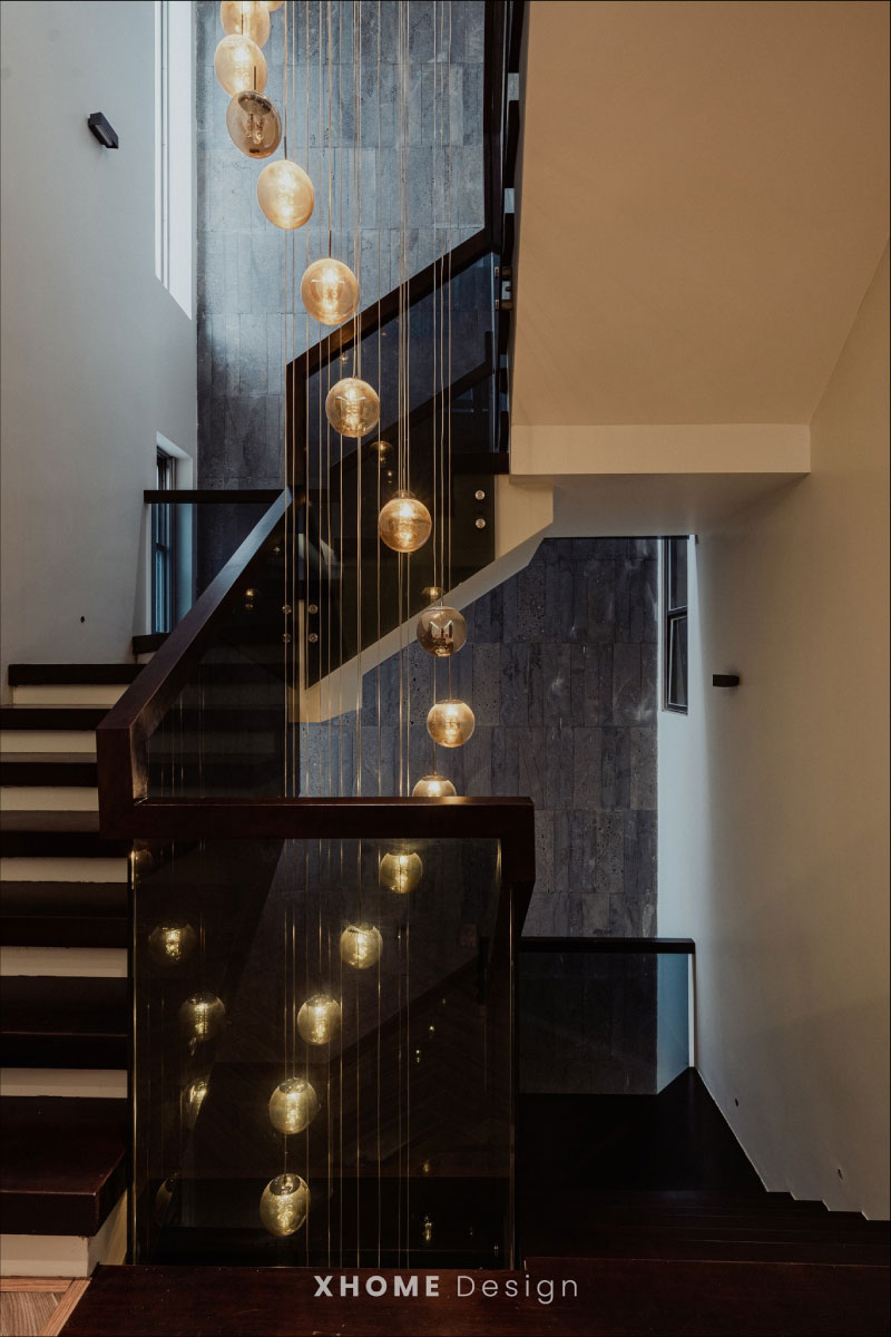Khu vực cầu thang gây ấn tượng với hệ đèn thả nghệ thuật chạy dọc giếng trời, tạo hiệu ứng ánh sáng lung linh xuyên suốt các tầng. Tay vịn gỗ kết hợp kính cường lực hiện đại cùng mảng tường ốp đá xám mang lại tổng thể sang trọng và chiều sâu.