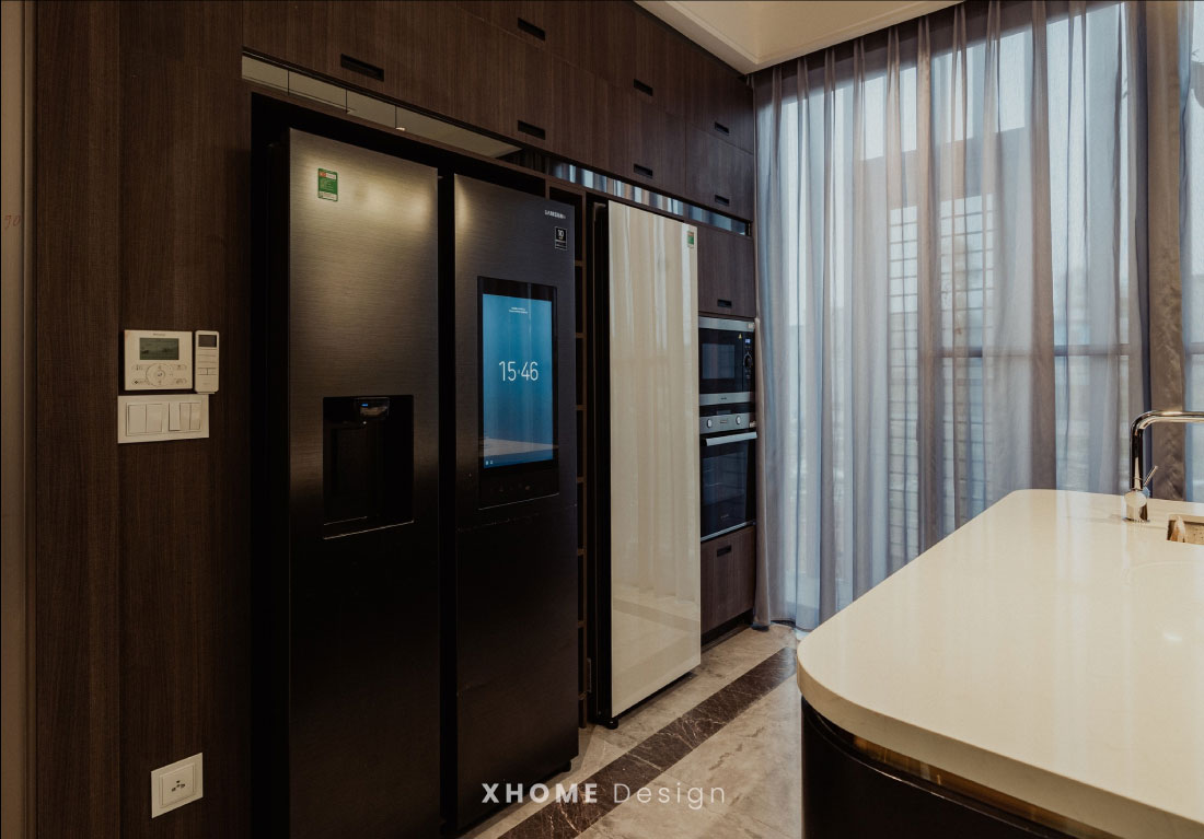 Không gian bếp – ăn mang đậm dấu ấn hiện đại với sự phân tách chức năng rõ ràng và tổ chức hợp lý. Khu vực bàn ăn nổi bật với bàn đá vân nâu cao cấp kết hợp chân inox ánh vàng sang trọng, được chiếu sáng bởi cụm đèn thả pha lê tạo hình giọt nước tinh xảo. Toàn bộ không gian được bao quanh bởi hệ cửa kính lớn cùng rèm hai lớp, giúp ánh sáng tự nhiên lan tỏa mềm mại vào ban ngày. Khu bếp khép kín sử dụng hệ tủ laminate nâu – trắng kết hợp mặt đá trắng tinh tế, tích hợp đầy đủ thiết bị hiện đại như tủ lạnh màn hình cảm ứng, lò nướng, lò vi sóng âm tủ… tạo nên không gian tiện nghi và tối ưu công năng.