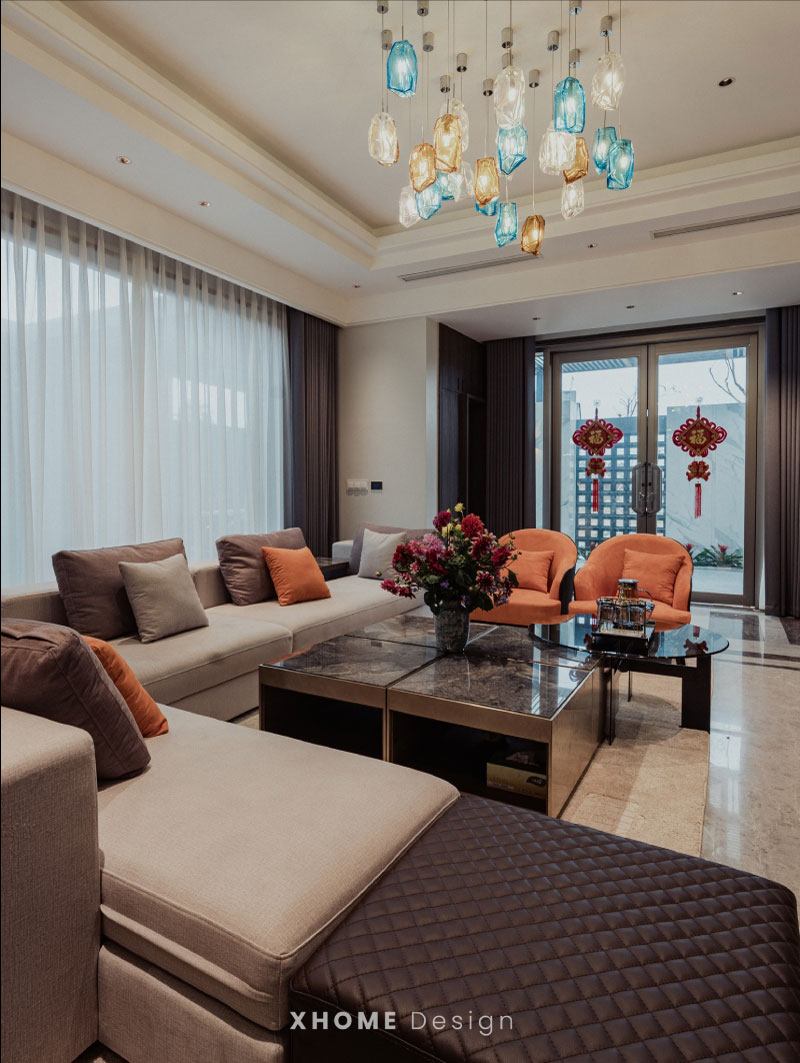Phòng khách được thiết kế theo phong cách hiện đại với bố cục mở rộng rãi, sử dụng tông màu trung tính kết hợp điểm nhấn cam nổi bật. Bộ sofa chữ U phối cùng bàn trà đá marble và bàn phụ kính tạo nên tâm điểm thẩm mỹ cuốn hút. Hệ vách tivi ốp đá kết hợp mảng gỗ sọc đứng phía sau mang lại chiều sâu và vẻ cao cấp. Đèn trần pha lê với gam màu độc đáo vừa tạo điểm nhấn ấn tượng vừa lan tỏa ánh sáng mềm mại khắp không gian. Các chi tiết trang trí như bình gốm lớn, kệ decor gắn tường, lọ hoa tươi và cây xanh gợi hơi thở Á Đông, góp phần cá nhân hóa không gian, mang đến cảm giác ấm cúng và gần gũi.